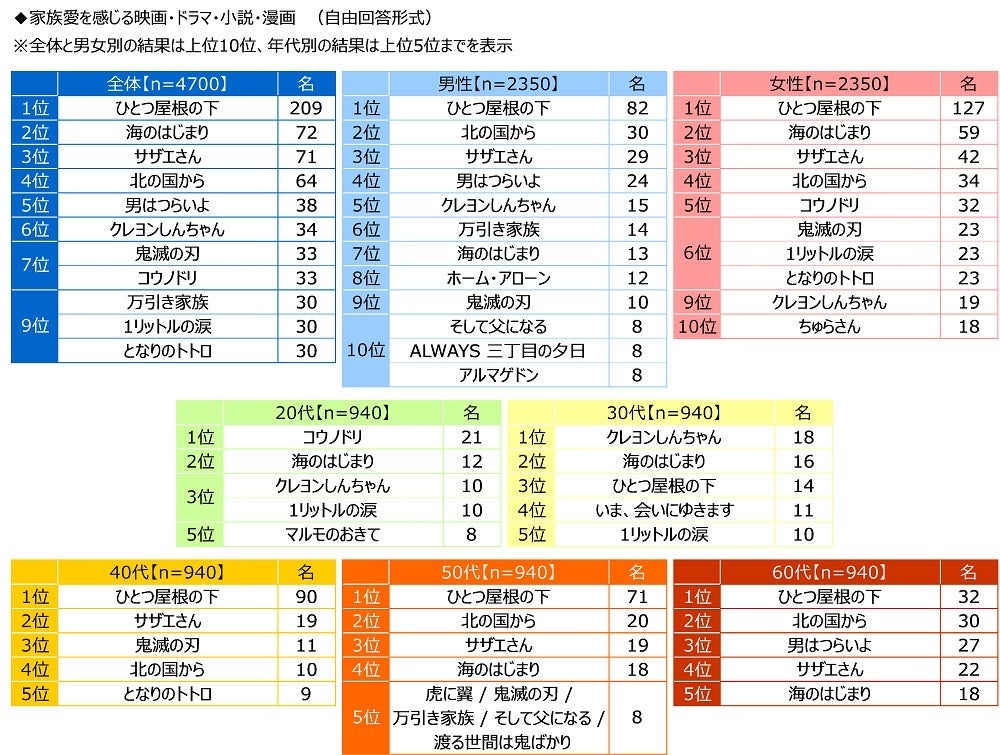 男女別にみると、男性・女性とも1位は「ひとつ屋根の下」(順に82名、127名)、男性では2位「北の国から」(30名)、3位「サザエさん」(29名)、女性では2位「海のはじまり」(59名)、3位「サザエさん」(42名)となりました。