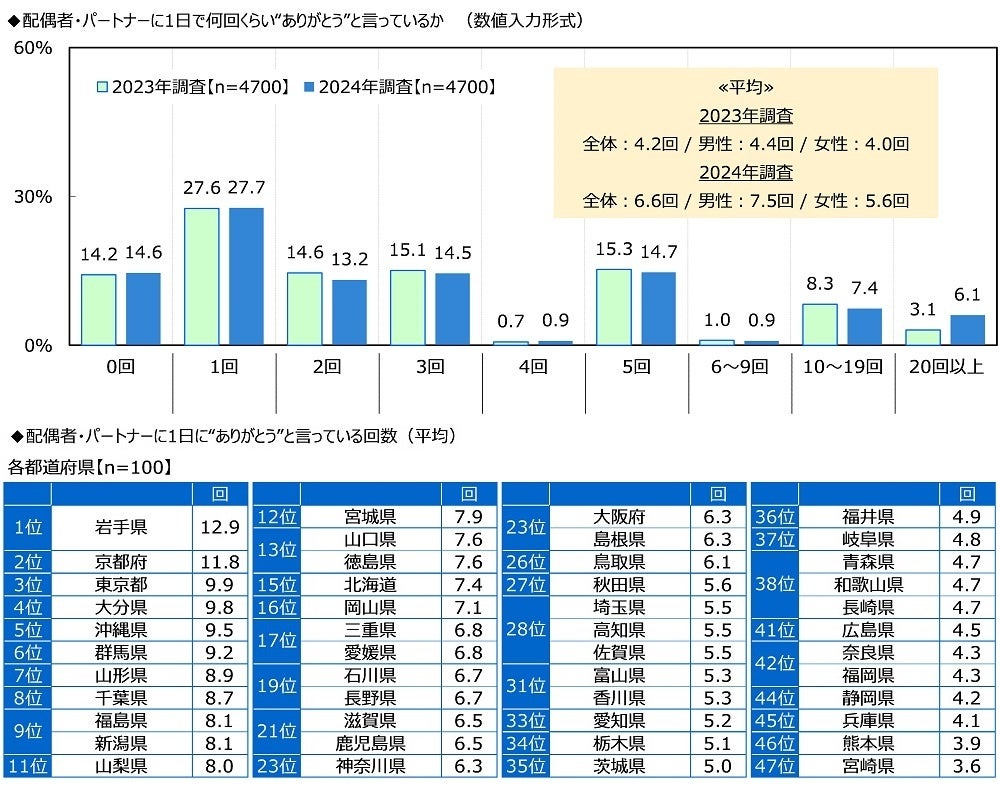 配偶者・パートナーに“ありがとう”と言っている回数 平均は6.6回/日