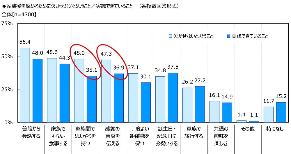 “欠かせないと思うこと”と“実践できていること”を比較すると、「家族間で思いやりを持つ」(欠かせないと思うこと48.0%、実践できていること35.1%)と「感謝の言葉を伝える」(欠かせないと思うこと47.3%、実践できていること36.9%)では、“実践できていること”とした割合のほうが“欠かせないと思うこと”とした割合よりも10ポイント以上低くなりました。家族愛を深めるうえで大切だとわかってはいても、家族に対し思いやりを持ったり感謝の言葉を伝えたりすることを十分にできていない人が少なくないようです。