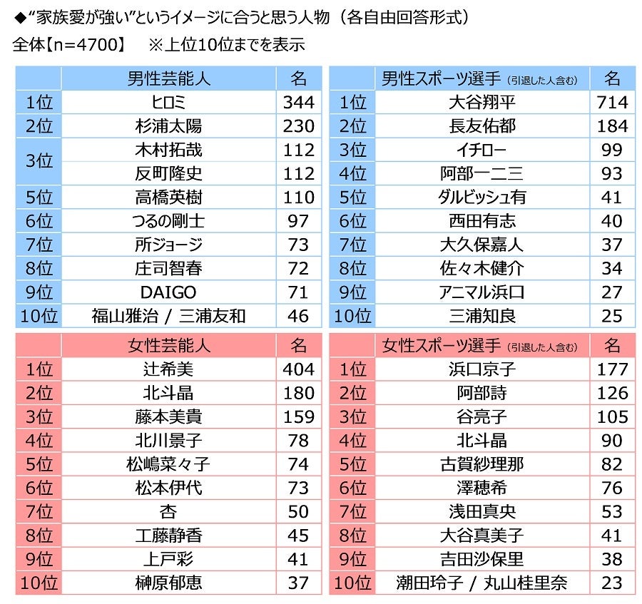 “家族愛が強い”というイメージに合うスポーツ選手を聞くと、男性スポーツ選手では2024年2月に結婚を発表した「大谷翔平さん」がダントツとなり、2位「長友佑都さん」、3位「イチローさん」、女性スポーツ選手では1位「浜口京子さん」、2位「阿部詩さん」、3位「谷亮子さん」という結果に。