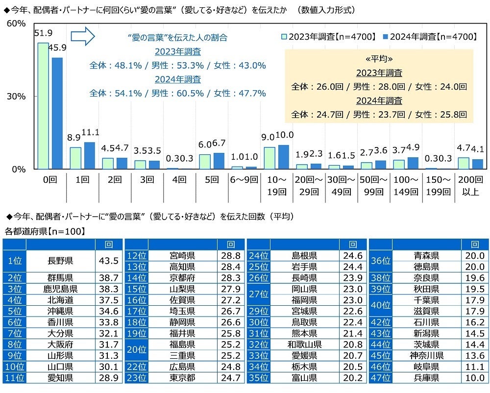 今年、配偶者・パートナーに“愛の言葉”を伝えた回数 平均は24.7回
