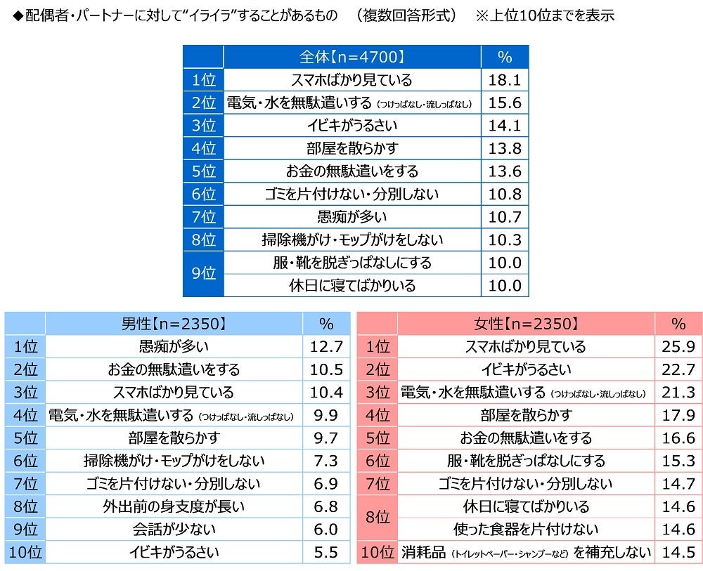男女別にみると、男性では1位「愚痴が多い」(12.7%)、2位「お金の無駄遣いをする」(10.5%)、3位「スマホばかり見ている」(10.4%)、4位「電気・水を無駄遣いする(つけっぱなし・流しっぱなし)」(9.9%)、5位「部屋を散らかす」(9.7%)、女性では1位「スマホばかり見ている」(25.9%)、2位「イビキがうるさい」(22.7%)、3位「電気・水を無駄遣いする(つけっぱなし・流しっぱなし)」(21.3%)、4位「部屋を散らかす」(17.9%)、5位「お金の無駄遣いをする」(16.6%)となりました。