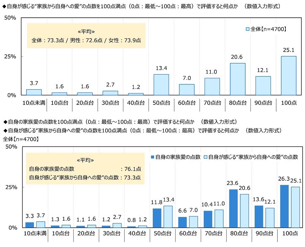 他方、自身が感じる“家族から自身への愛”の点数を100点満点(0点:最低~100点:最高)で評価すると何点か聞いたところ、「80点台」(20.6%)や「100点」(25.1%)に多くの回答が集まり、平均は73.3点でした。男女別に平均をみると、男性72.6点、女性73.9点でした。