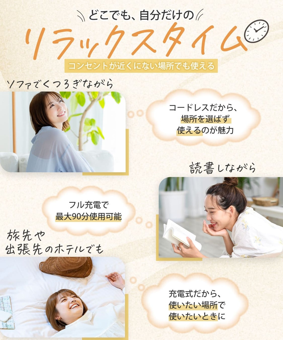 フル充電で最大約90分使用可能。コンセントを気にせず、どこでもリラックス時間を楽しめます。