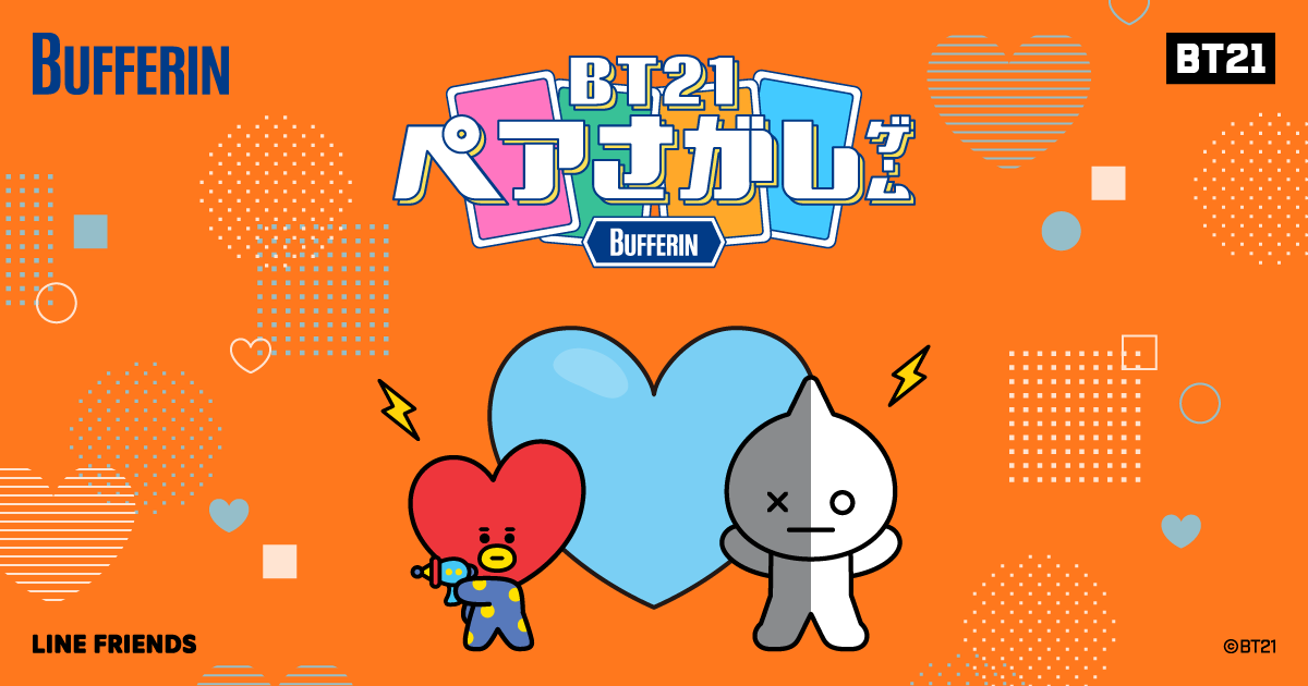 本キャンペーンでは、裏返しのカードをめくってBT21の各キャラクターとハートの絵を完成させる「ペアさがしゲーム」がキャンペーンサイトに登場。ハートの色を合わせてペアを完成させると、揃えたカードの画像をダウンロードすることができます。さらに、ゲームに参加して応募すると、BT21とバファリンによるオリジナルグッズ4種(※1)の中から、お好きな賞品が抽選で合計100名様に当たります。