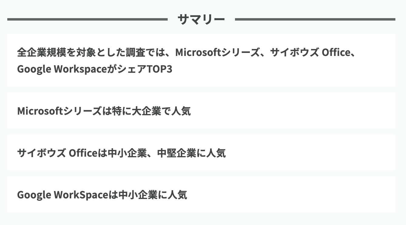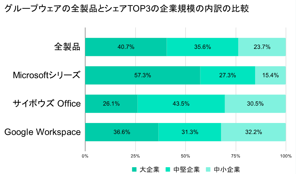 シェア上位3製品の企業規模ごとの内訳を見てみると、特に大企業に強いMicrosoftシリーズ、中堅〜中小企業に強いサイボウズ Office、企業規模を問わず比較的満遍なく利用されているGoogle Workspaceと、それぞれ異なる特徴が見られました。