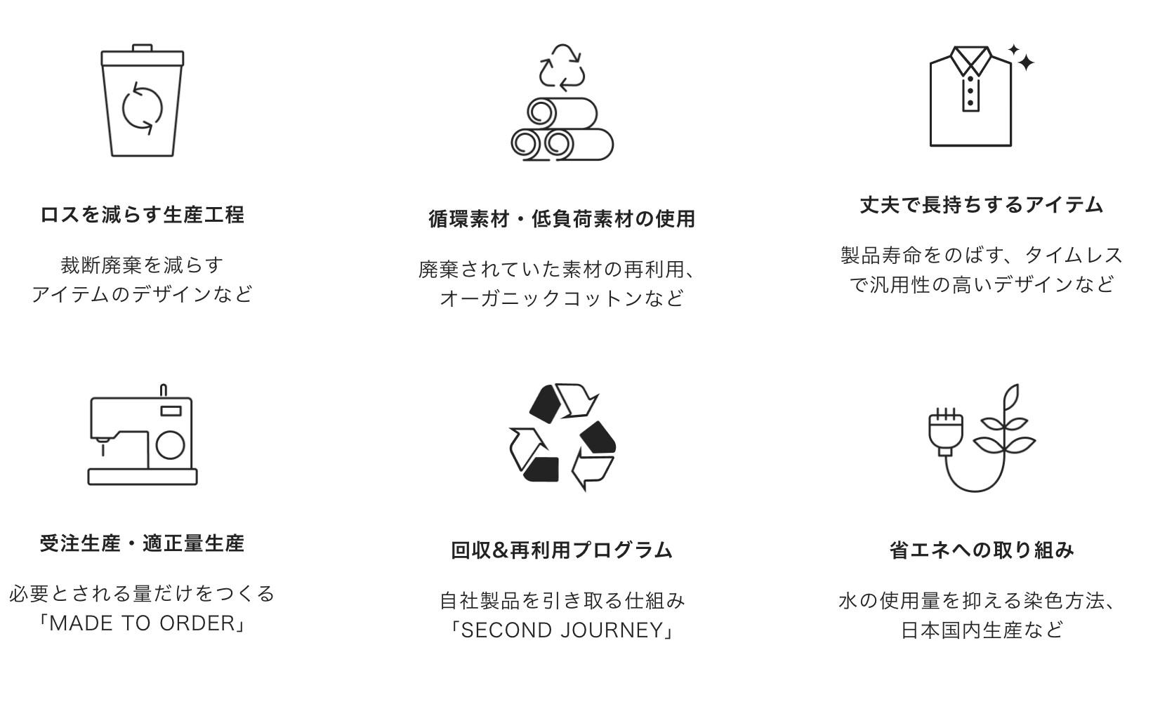 環境負荷を低減するために、従来の大量生産 → 大量廃棄のサイクルではなく、受注生産「MADE TO ORDER」をはじめとした適正量の生産 → アイテムの回収&再利用プログラム「SECOND JOURNEY」などのほか、さらなる取り組みにも挑戦しつづけます。