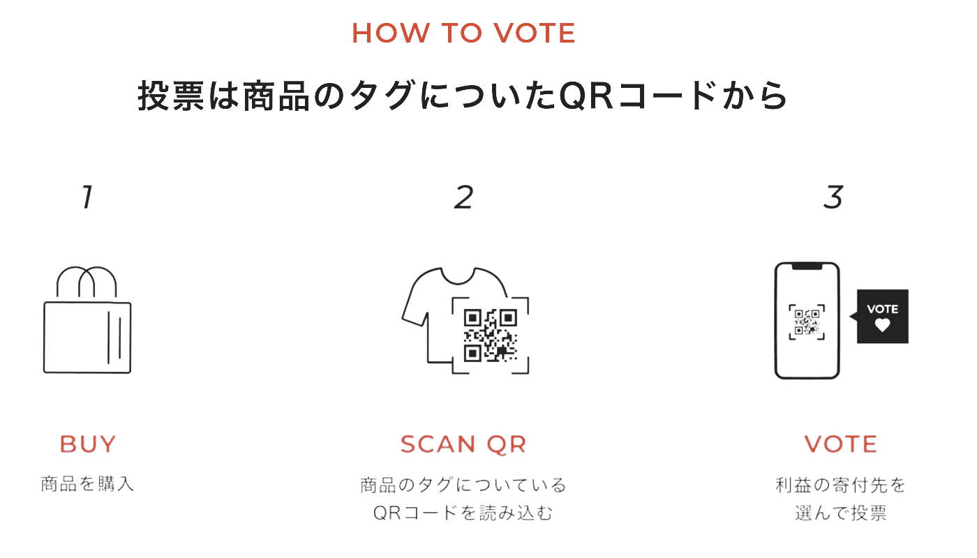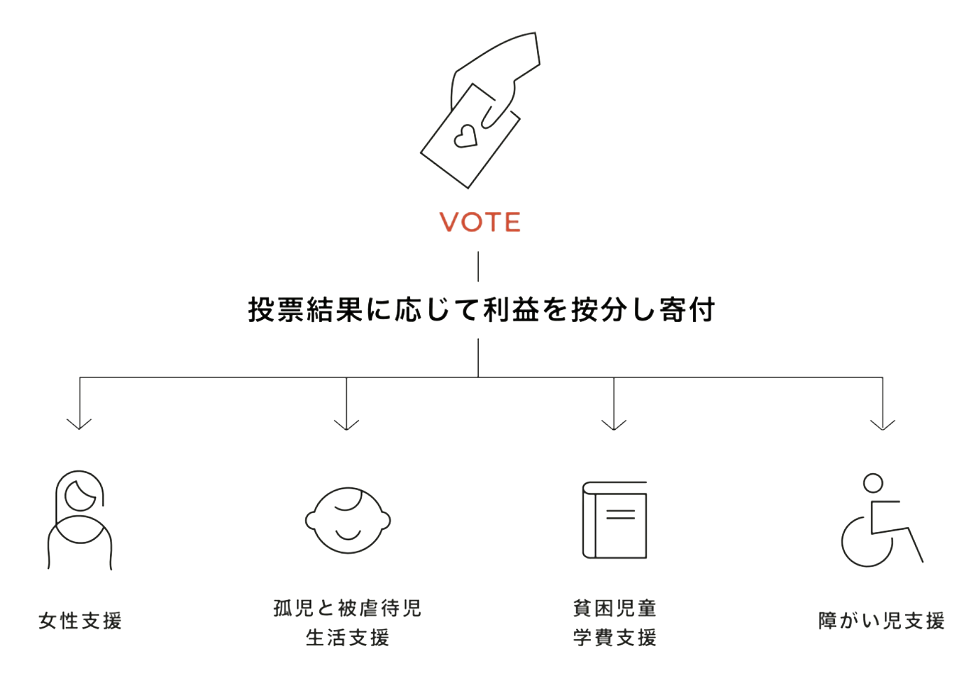 アイテムについているQRコードを読み取るだけで、利益の寄付先を投票できます。 投票結果に応じて、利益(分配可能額)の80%を按分、寄付します。