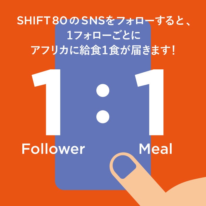 Instagram、Twitter、LINEで、フォローいただくと1アカウントごとに、給食1食分を寄付。3つのSNSに登録いただければ、給食3食を届けることができます。まずは、フォローボタンをタップするところから「SHIFT 80」に参加してみませんか。