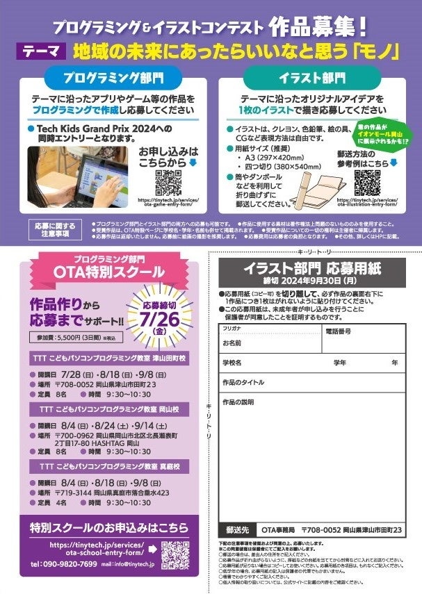 岡山県内の小学生に向けたプログラミング&イラスト作品コンテスト。テーマは「地域の未来にあったらいいなと思う『モノ』」。今年度は「Tech Kids Grand Prix」と連携。応募は9月30日まで。