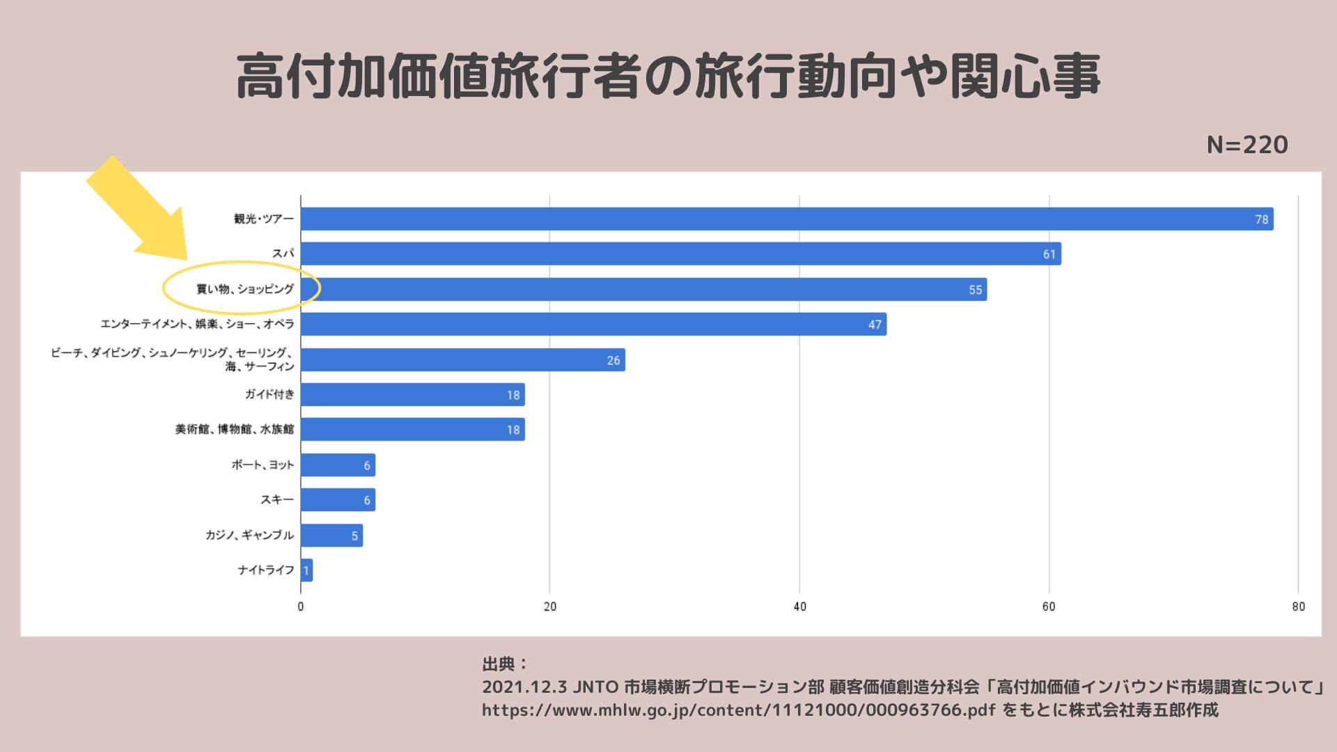 日本政府観光局(JNTO)による「高付加価値インバウンド市場調査について」の調査結果をみると、高付加価値旅行者の旅行動向や関心事の中で「買い物・ショッピング」は「観光・ツアー」や「ホテルでのスパ」に次いで55%以上を占め、多くの高付加価値旅行者や訪日外国人が日本のファッションや買い物を体験することへの関心が高いことが明らかになっています。