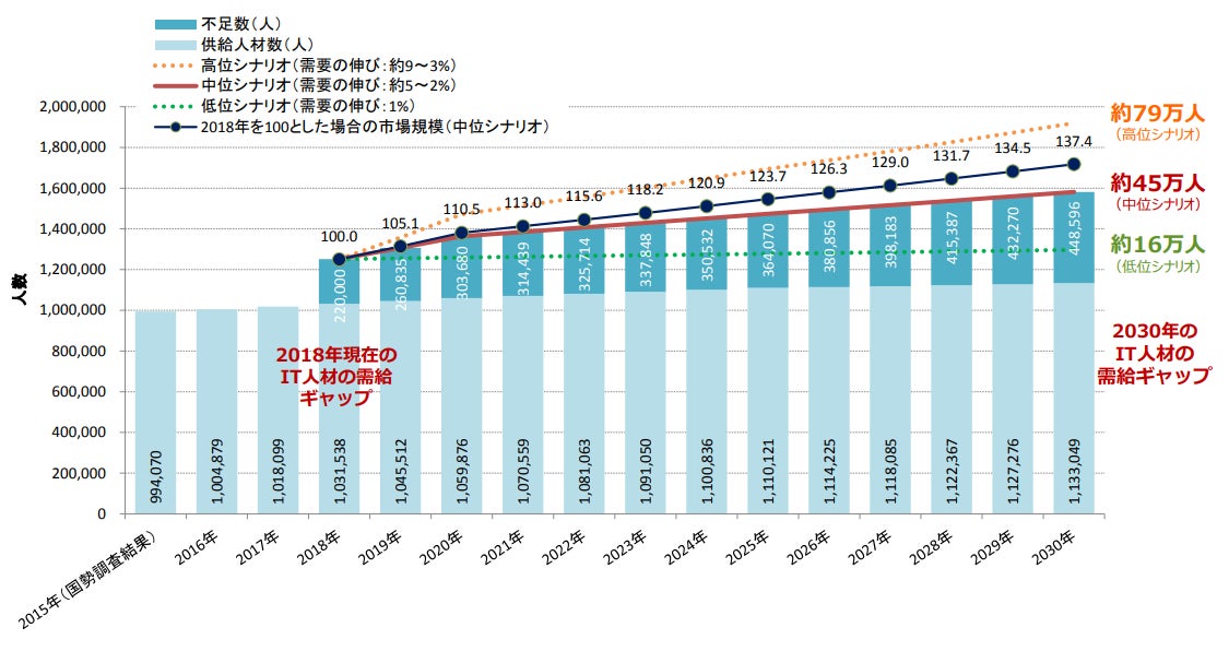 経済産業省が平成28年6月に公表した「IT人材の最新動向と将来推計に関する調査」によると、IT需要が今後拡大する一方で、日本の労働人口(特に若年人口)は減少が見込まれ、IT人材の需要と供給の差(需給ギャップ)は、需要が供給を上回り、2030年には最大で79万人のIT人材が不足することが予測されています。その中でも特に日本においてエンジニア採用は年々難しくなっており、採用に至るまでの時間も増加の一途を辿っています。2022年7月期のエンジニアの有効求人倍率(*)は3.4となり、3〜4社が1人のエンジニアの採用を巡って争奪戦を行なっている状況です。