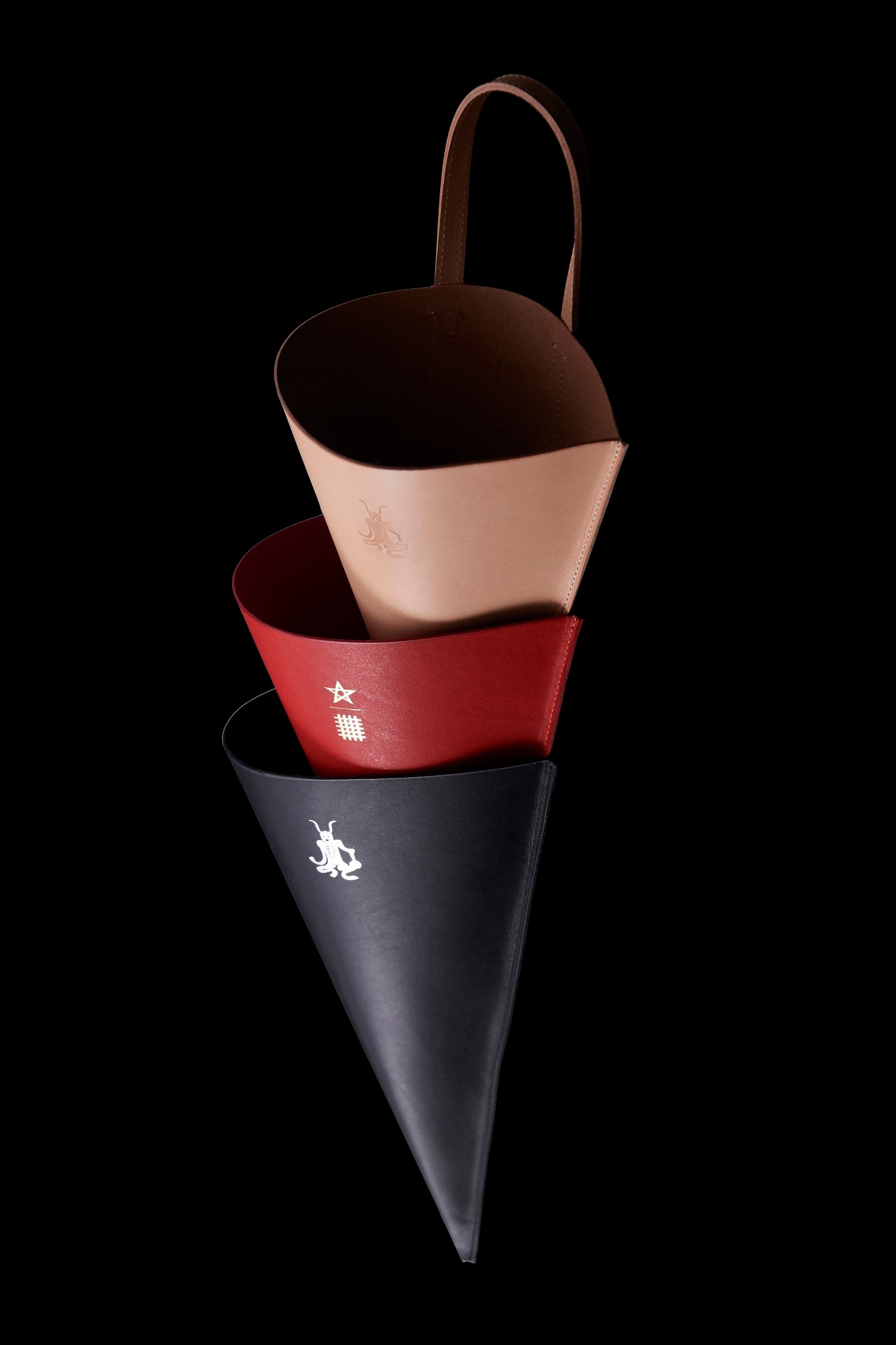創悦がデビューより取り組んでいる浮世絵からは、葛飾北斎が「北斎漫画」に描いた様々な鳥居やオオカミ、虎、鐘馗様のモチーフをアレンジ。また魔除けのシンボルである、角大師、セーマン、ドーマン、予言の鳥などのオリジナルモチーフのレザーグッズを制作。バッグや小物の他、魔除けにちなんだコーヌコピア(幸せの角)、お守りケース、伊勢の清めの水と塩のケースなど多彩なアイテムを制作。魔除けの背守りをあしらったウエアや帽子などのファッションアイテムも展開します。オールレザーのアートピースとしては、鳥獣被害対策の鹿革を使った着物や3Dに浮かび上がるオオカミの頭骨や鬼瓦を配したバッグ、レザー甲冑をまとったシャーマン(祈祷師)も登場します。
