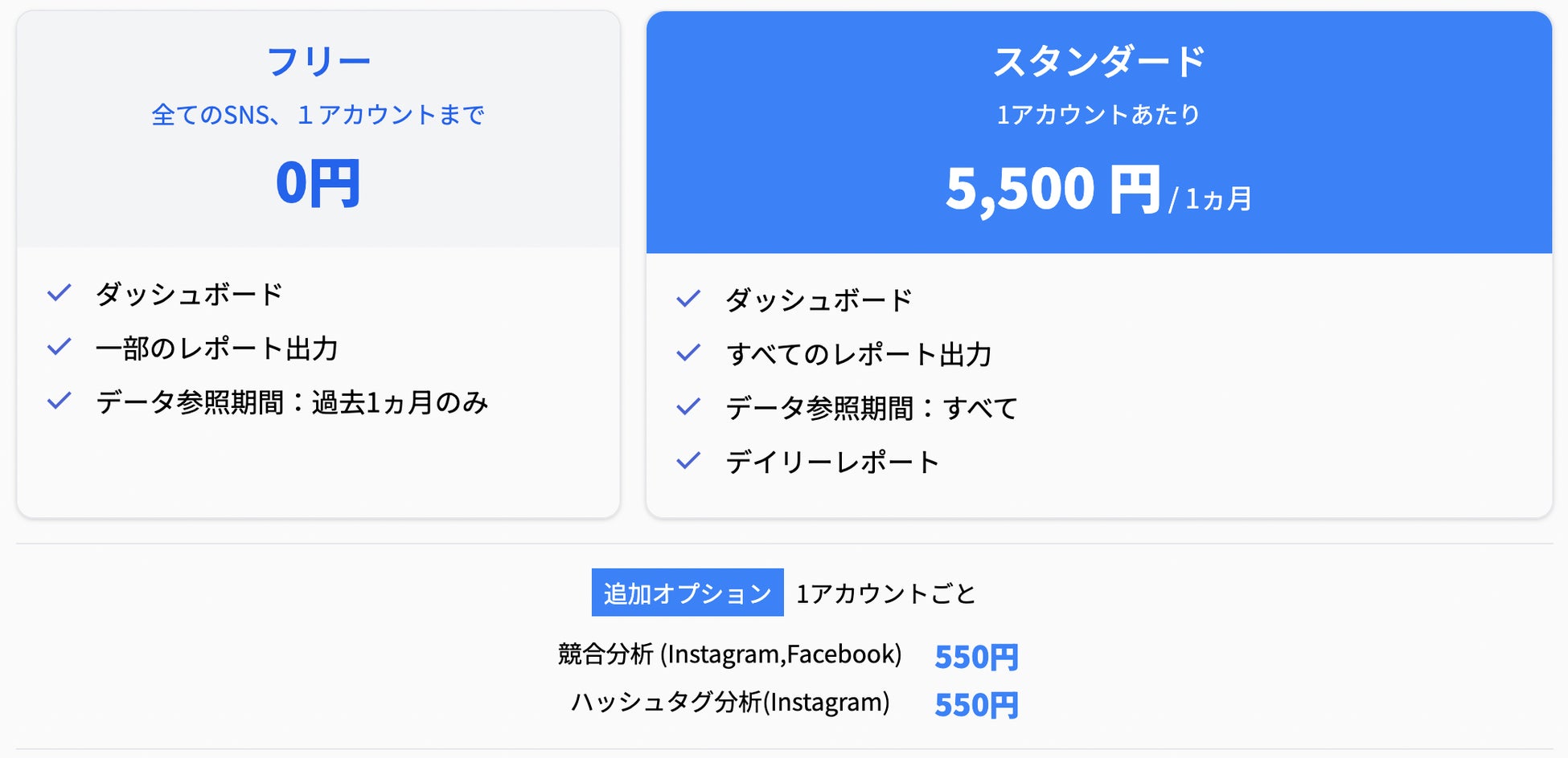 プランは「フリー」と「スタンダード」のみ。どのSNSでも1アカウント月5,000円(税別)でご利用いただけます。