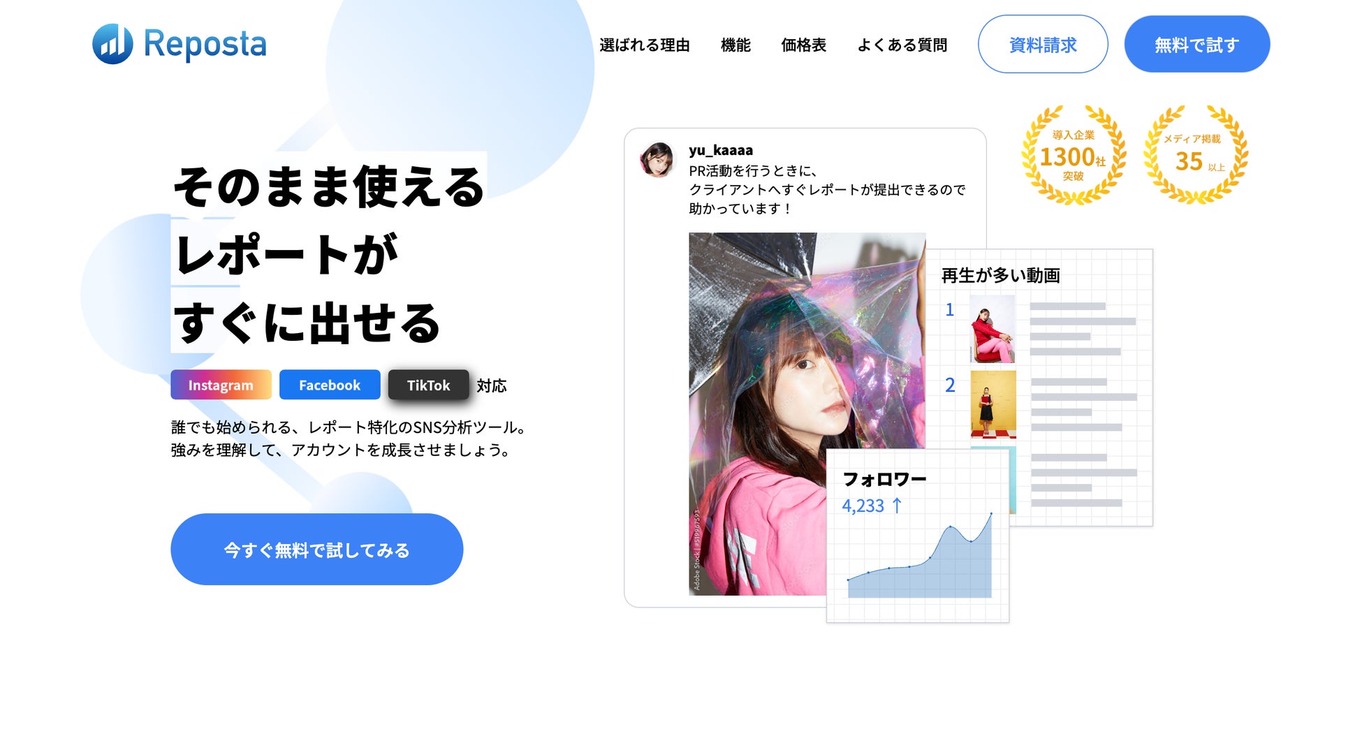株式会社ROC(本社:神戸市中央区、代表取締役:坂本翔)は、これまでInstagram・Facebookのみで展開をしていたSNSレポートツール「Reposta(レポスタ)」のTikTokレポート機能を、2024年1月17日にリリースしました。