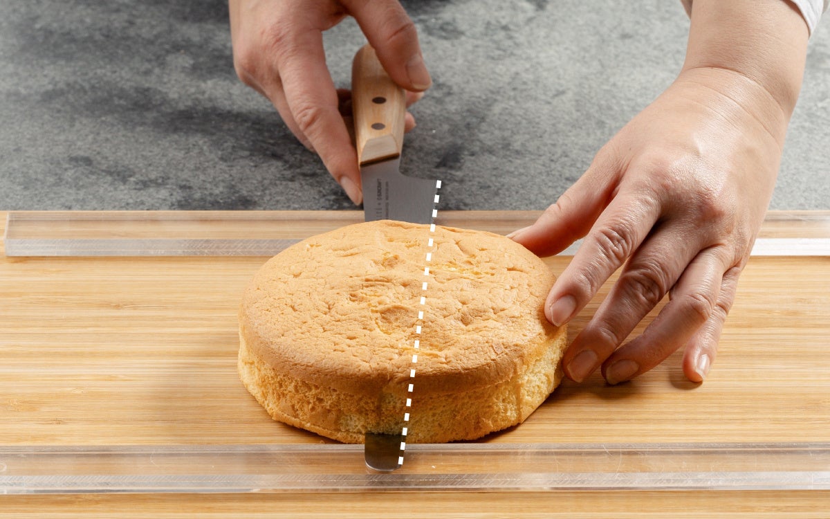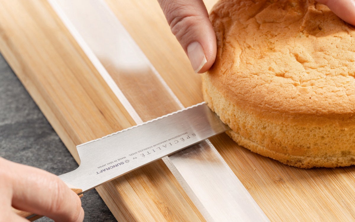 連続する小さな山なりの刃で繊細なジェノワーズ生地を優しくカット