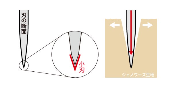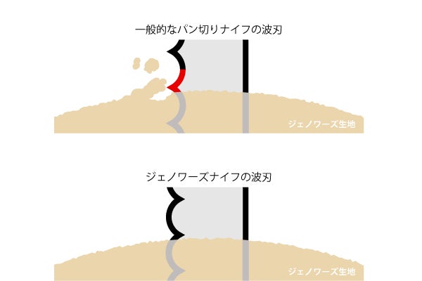 山なりの丸い形が連続する形の波刃で、繊細なジェノワーズ生地をひっかけることなくスムーズにスライスできます。一般的なパン切りナイフは、鋭い形の波刃で力強く食材に切り込みますが、このジェノワーズナイフは抵抗が少なく柔らかなケーキ生地を傷つけないようにカットできます。
