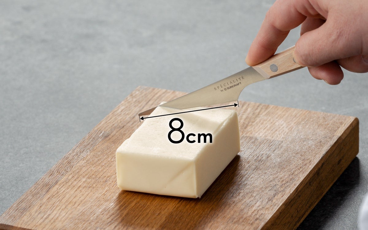 刃渡りは8cmなので、200gのブロックバターの切り出しに丁度いいサイズです。