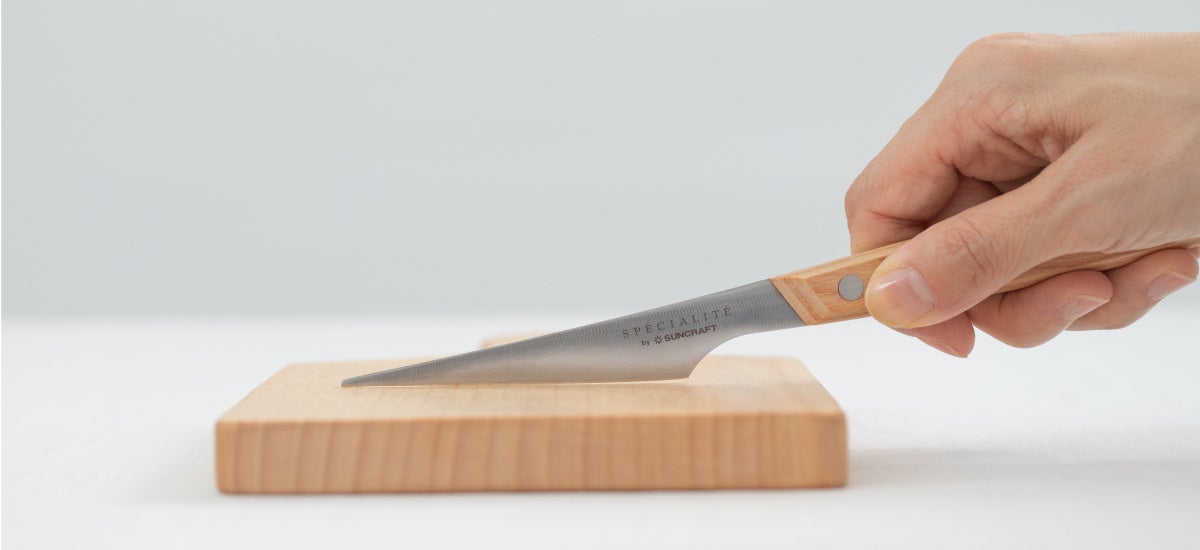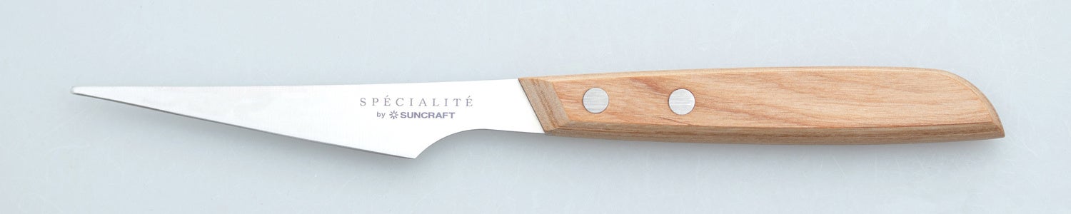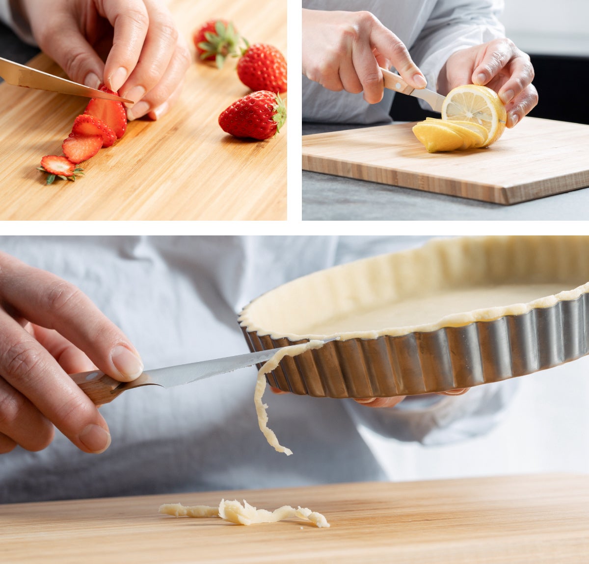 身幅が狭く、刃渡りが短い切れ味のいいマルチナイフです。食材がくっつきにくい構造なので、お菓子作りで欠かせないバターの切り出しがスムーズにできます。イチゴやレモンスライスなどお菓子作りで使われる小さな食材のカットにもおすすめです。