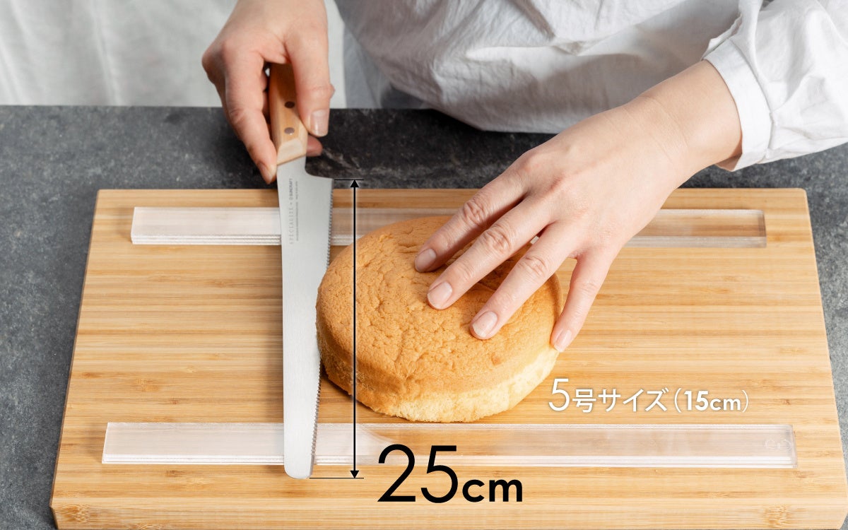 刃渡りは25cmで、ケーキ作りの基本となる直径15cmの5号ケーキにちょうどいいサイズ。大きなストロークでケーキをスライスできるので、ケーキの断面が美しく仕上がります。