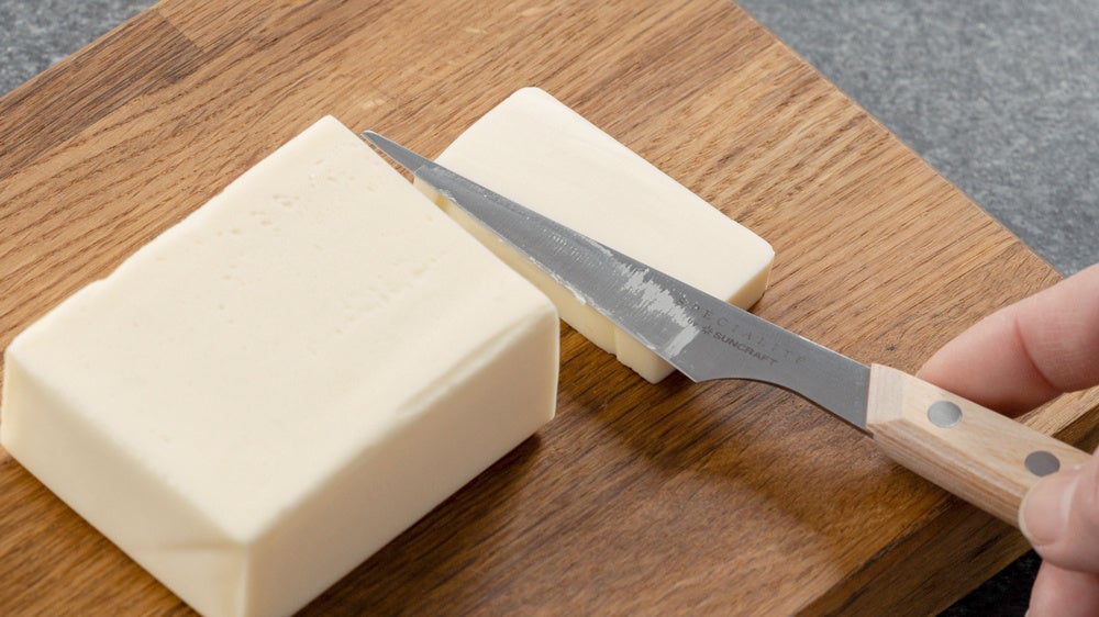 包丁作りで欠かせない研削(けんさく)の技術を応用し、バターを楽に切ることができる薄い刃に仕上げました。更に刃の身幅を狭くし、通常の包丁とは違った刃付けをすることで、切ったバターがくっつきにくく、ストレス無くスライスできます。