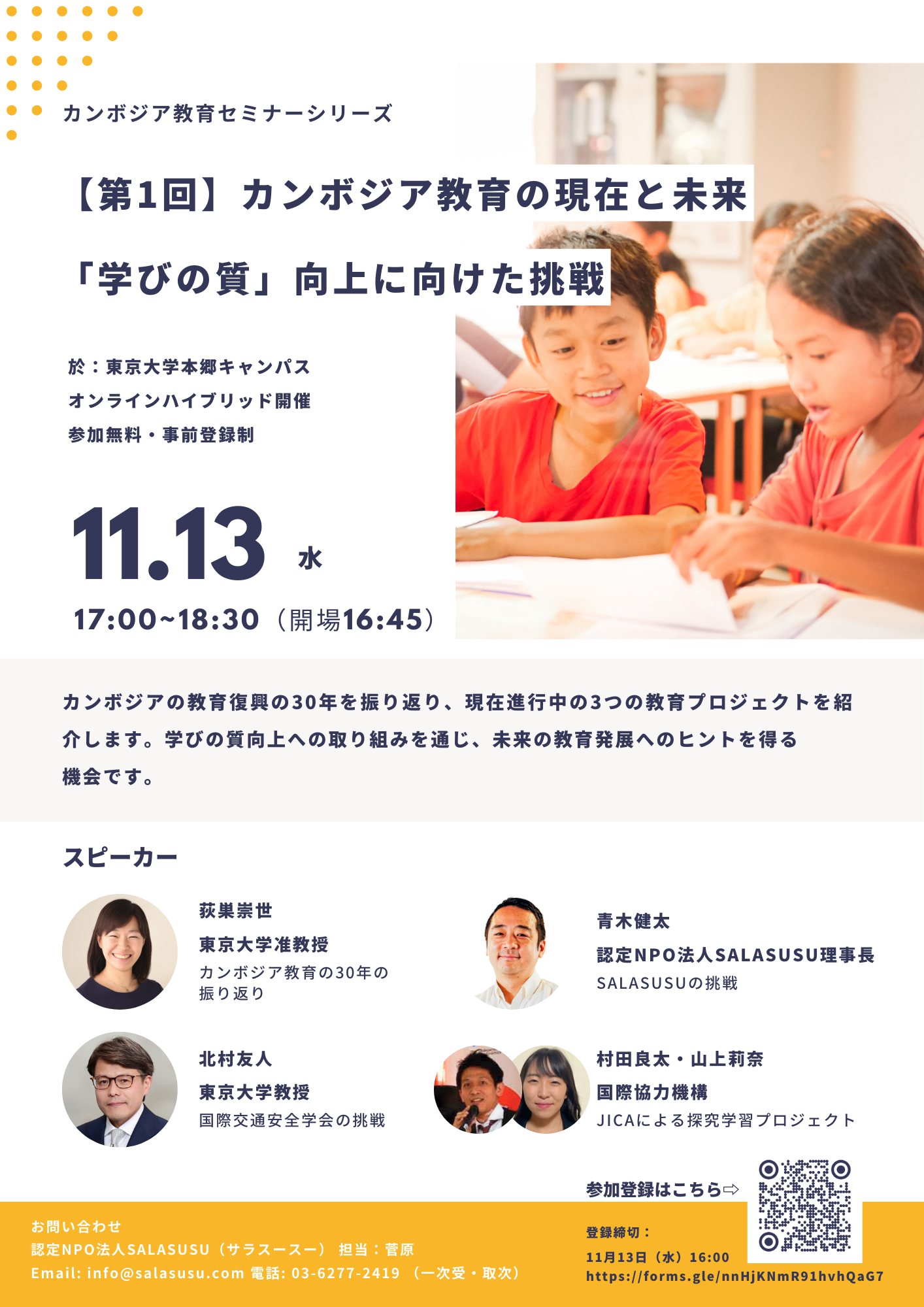 認定NPO法人SALASUSU(サラスースー、本部:福岡県北九州市、理事長:青木健太)は、文部科学省の「EDU-Portニッポン」応援プロジェクトに採択され、東京大学の教育専門家と共にカンボジアの公教育改革を推進。11月13日に開催される東京大学での共同セミナーでは、カンボジアの教育の未来を見据えた議論が展開されます。セミナーへの参加登録はこちら