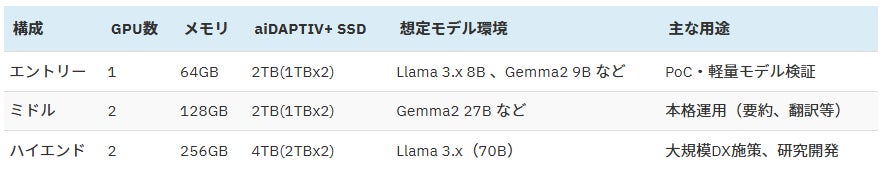 Intel® Xeon® w5-3525とNVIDIA RTX 6000 Adaをベースに、いずれもNVMe Gen4 4TBのSSDを標準搭載、主な違いはメモリ容量とGPU枚数、aiDAPTIV+ キャッシュ用SSDの容量です。用途や想定モデル規模に応じて構成を柔軟にカスタマイズ可能です。