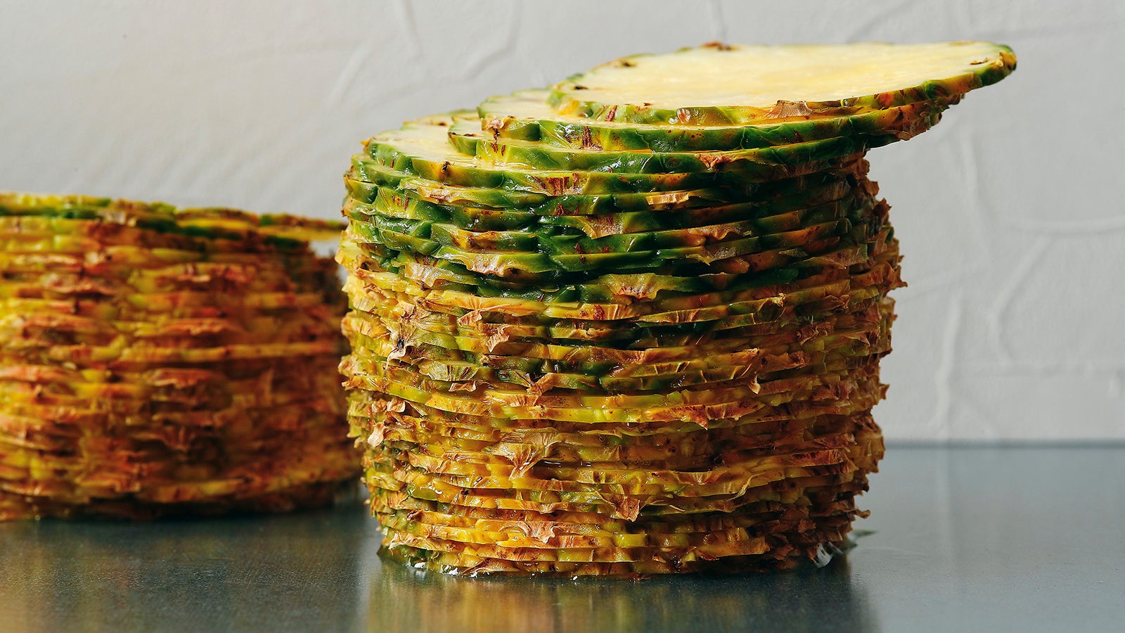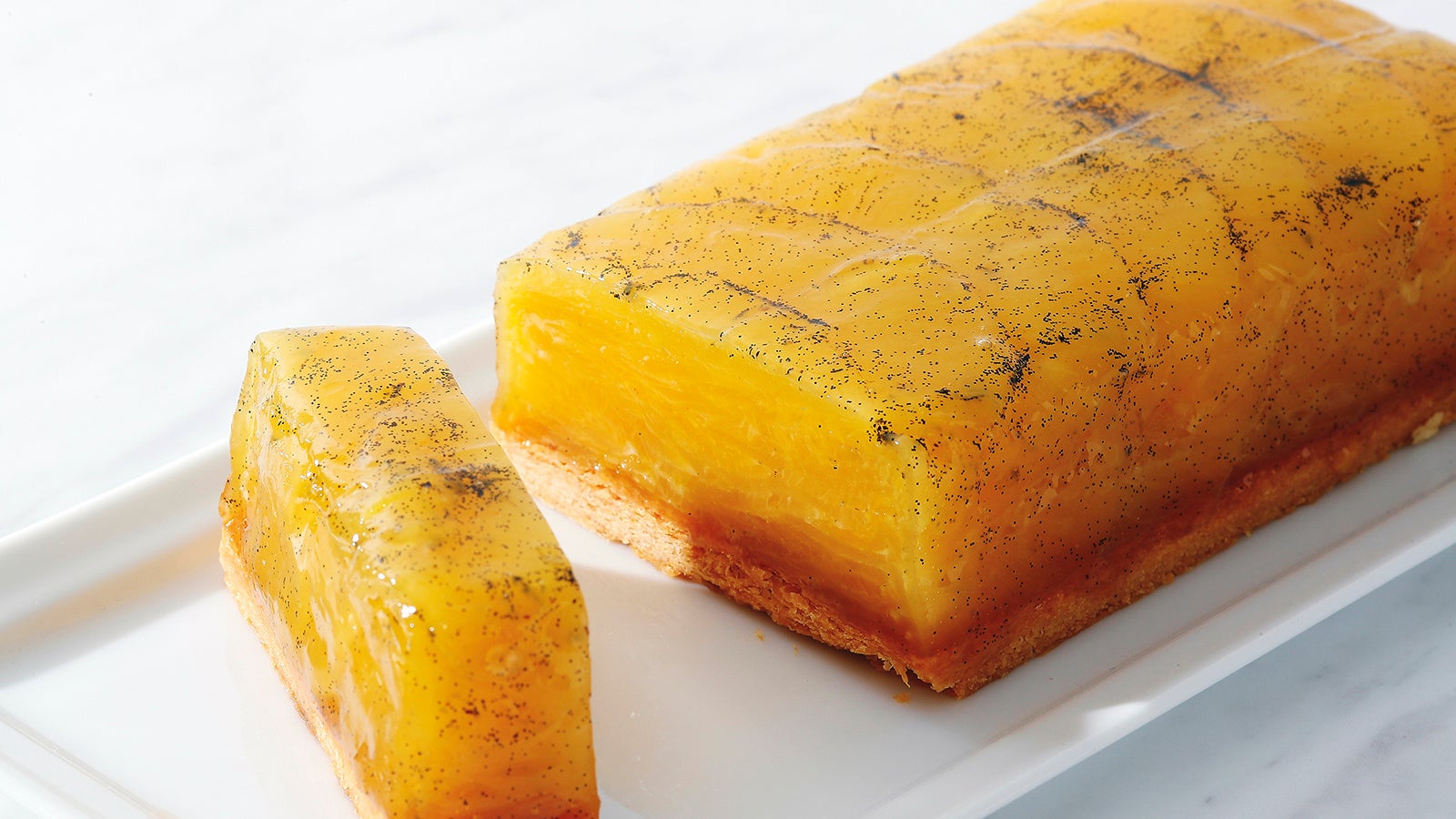 パイナップルの準備ができたら、型の大きさに揃えて焼き上げ、キャラメリゼしたパイ生地の上にのせます。 これで、透き通るような黄金色の「タルトタタン(アナナス)」が完成。