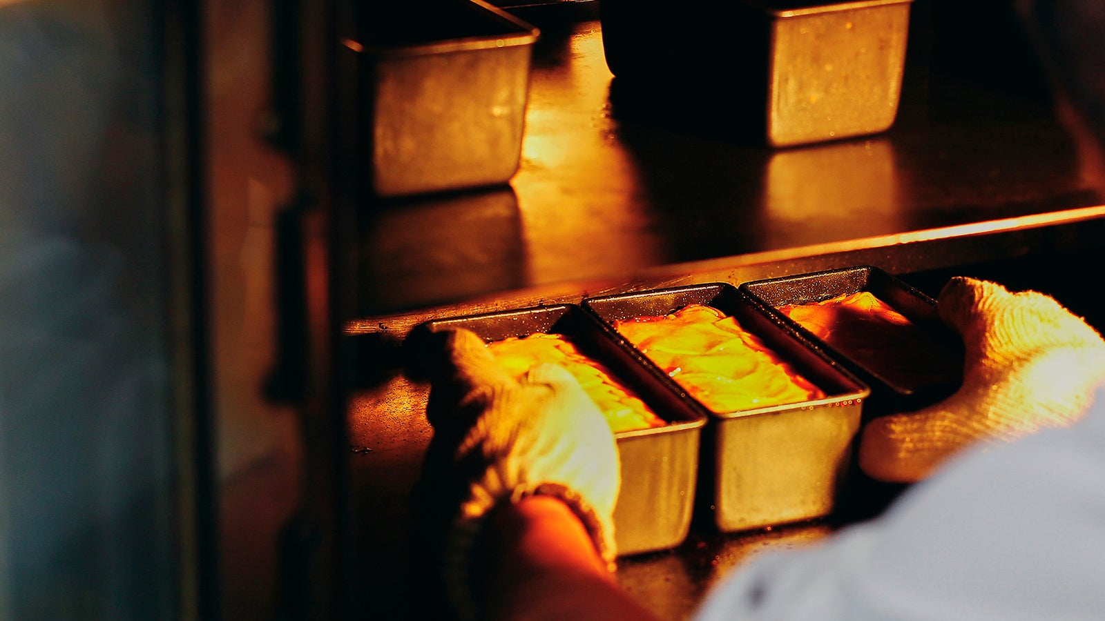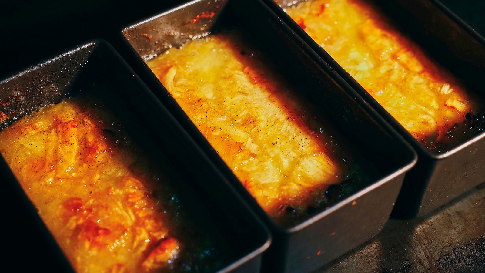 じっくりと馴染ませたら、次はいよいよ焼成。 オーブンで焼いた後に出てきたシロップを戻すように押しつけ、再び焼きます。こうすることでフルーツから出た旨味が再び中に戻り、味わいがぐっと凝縮して閉じ込められるのです。これを何度か繰り返して火を通したら、粗熱が取れるまで冷まして冷蔵庫で休ませます。