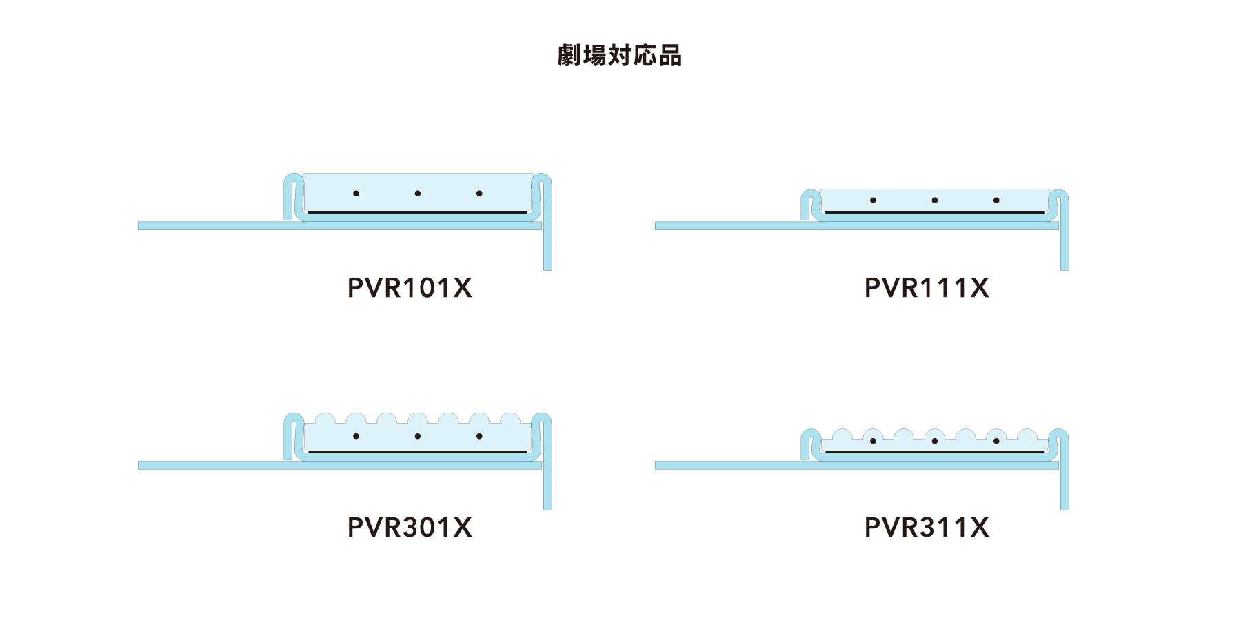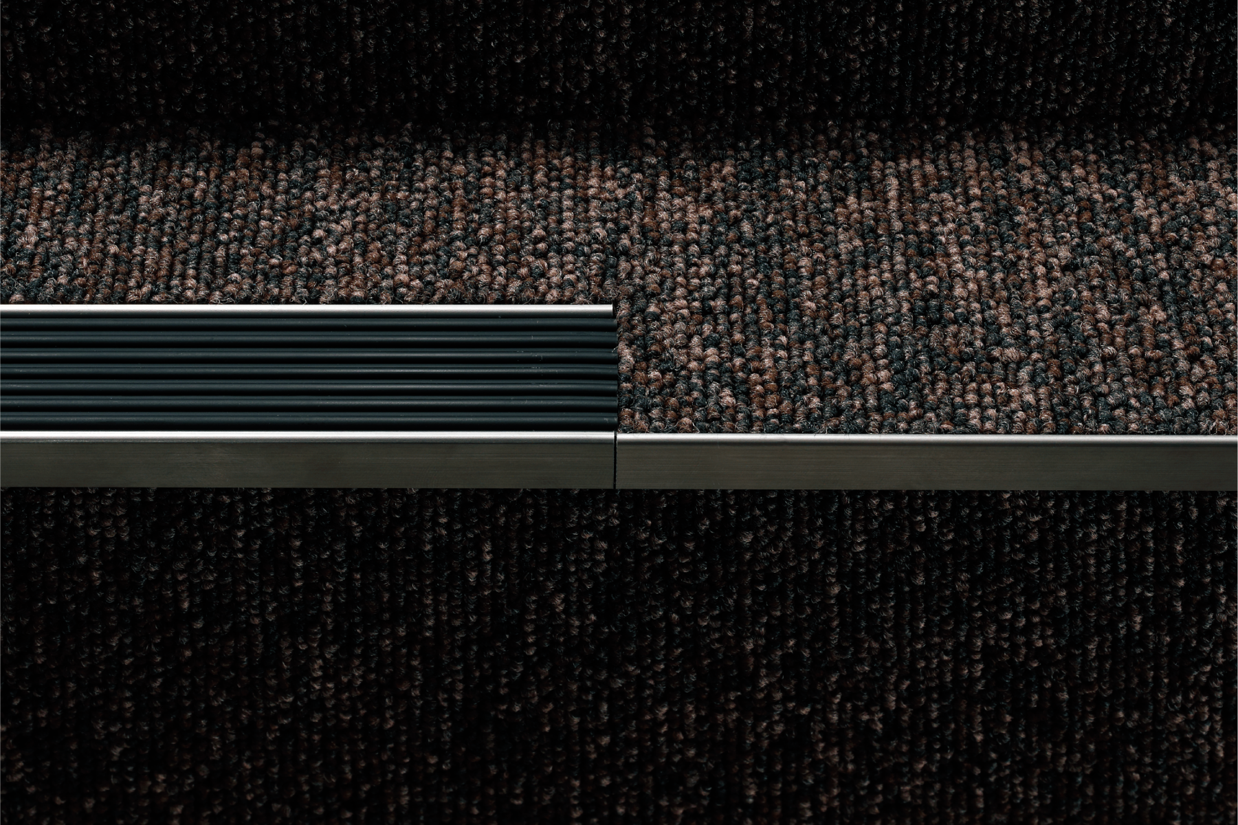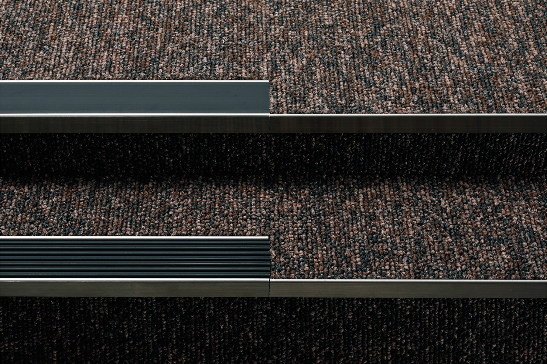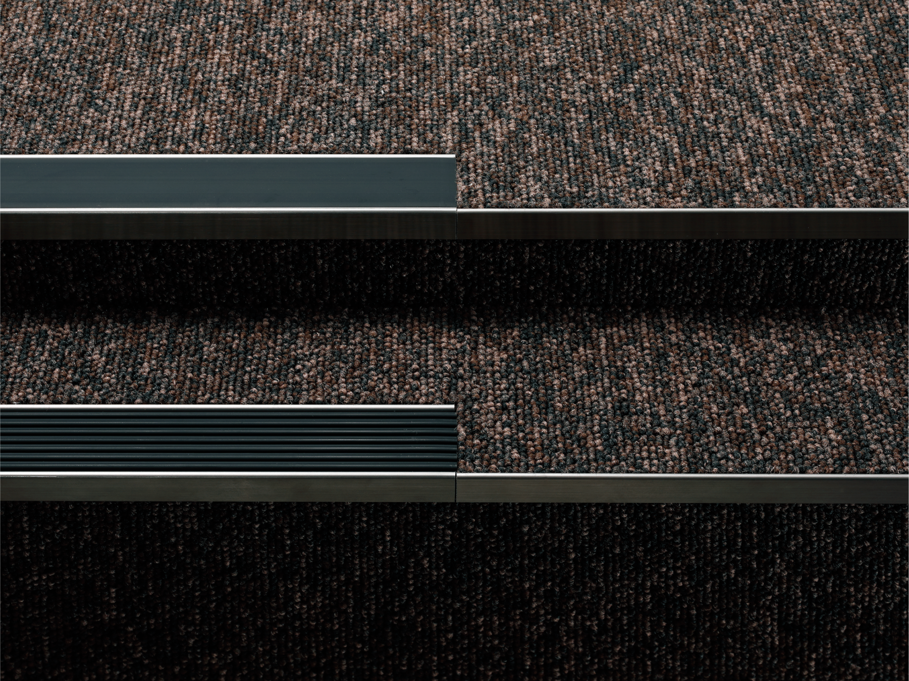 『Previo R』では、ノンスリップと段鼻保護見切りの断面形状を統一。劇場対応品(受注生産)との併用により、階段のノンスリップと座席エリアの段鼻保護見切りが、一直線に連続する美しい納まりが可能となる。