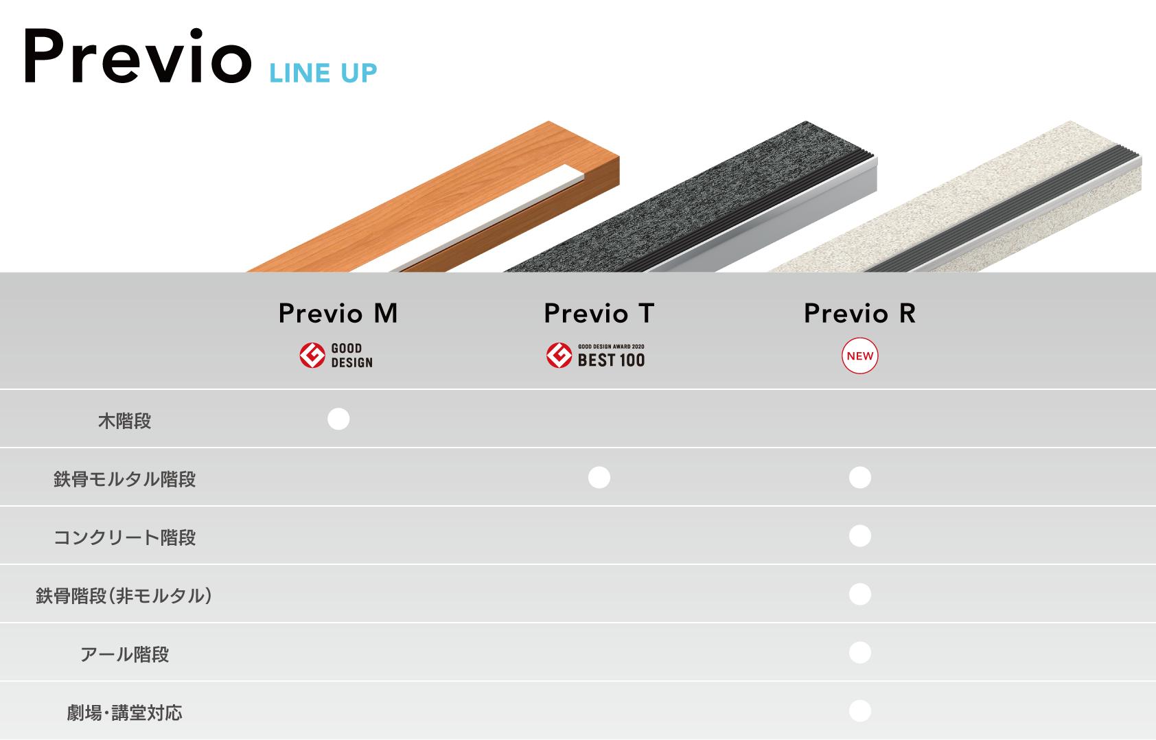ミニマル&コンパクトを究極まで推し進めた『Previo T』に対し、新商品の『Previo R』は、コンセプトの「ミニマルアート」を受け継ぎつつ、①ステンレスによる耐久性の向上、②安全性・施工性を高めた仕様、③広範な階段工法に対応可能な汎用性の高いデザインを実現した。デザイン至上主義の T に対し、使い勝手のよい R というポジショニングによって、互いに補完的なラインナップを形成する。
