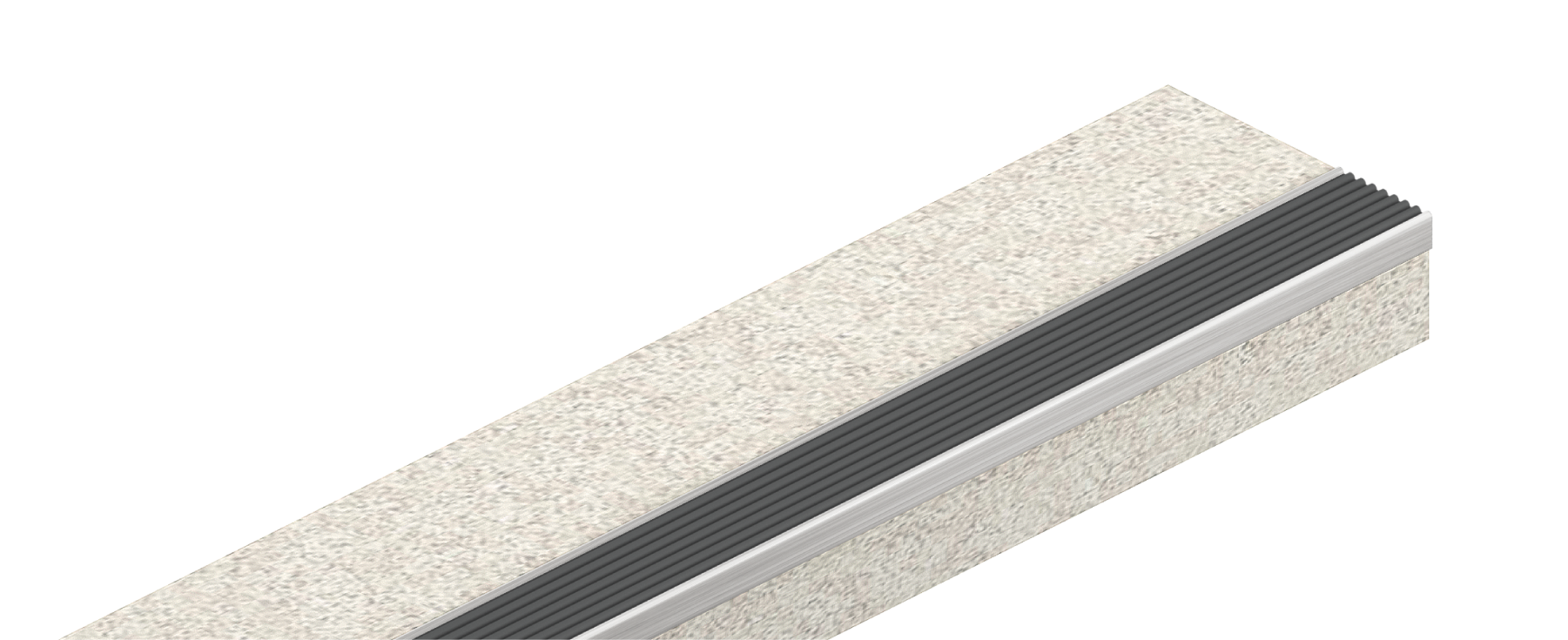 劇場や講堂のような「すり鉢状大空間」の設計において問題となるのが、座席エリアと階段の段鼻処理。従来の施工では、階段のノンスリップを座席エリアまでそのまま延長するか、ノンスリップとは断面形状の異なる見切り材を、不整合のままに座席エリアに設置するしか方法がなかった。