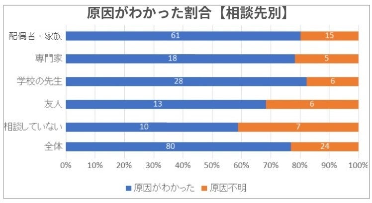 「お子さんの言動が変わった原因はわかりましたか?」との問いには、76.9%が「はい」と回答し、「相談先と原因がわかったかどうか」の関係を見ると、下記のような結果となった。