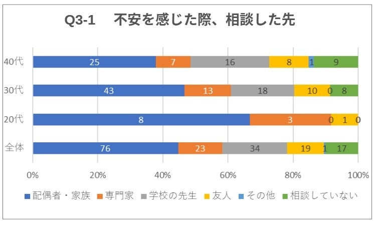 「お子さんの言動に不安を感じた際に相談した先」は、「配偶者・家族」が最も多く、年代別に見ると20代・30代の割合が多かった。