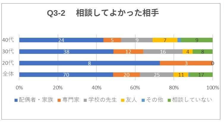 また、「その中で、相談してよかったと思った方はどなたですか?」との問いは、「配偶者・家族」「学校の先生」「専門家」という順に満足度が高いという結果となった。