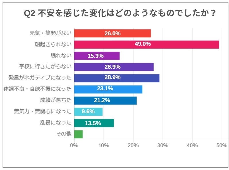 「不安を感じた変化はどのようなものでしたか」という質問では、「朝起きられない」が49.0%で一番多く、次いで「発言がネガティブになった」「 学校に行きたがらない」がそれぞれ28.9% 、26.9%となった。