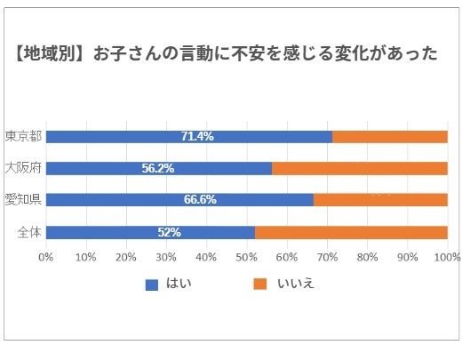 地域別に見てみると「東京都」「大阪府」「愛知県」は、「言動に不安を感じる変化があった」と答えた人がそれぞれ71.4%、56.2%、66.6%と、全国平均の52.0%を超えており、大都市はその他のエリアよりも言動に不安を感じる変化が多い傾向が見られた。