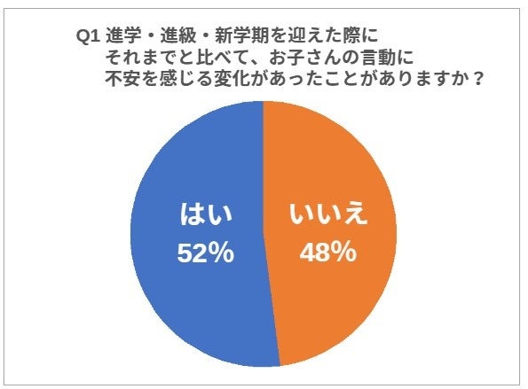 「進学・進級・新学期を迎えた際に、それまでと比べてお子さんの言動に不安を感じる変化があったことがありますか?」との問いに「はい」が52.0%、「いいえ」が42.0%となり、「不安を感じる変化があった」という保護者が半数以上となった。