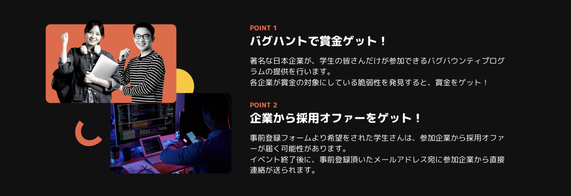 参加企業各社より、自社製品を対象とし、学生だけが参加出来るバグバウンティプログラムを、イベント期間中(2023年8月9日〜2023年8月31日)ご提供頂きます。