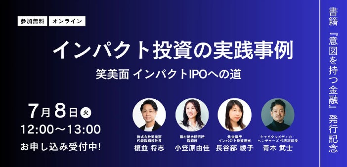 当日は、CMV代表・青木 武士氏と、当社代表の榎並に加えて、インパクト投資などの促進に携わる小笠原 由佳氏、元金融庁インパクト投資担当の長谷部綾子氏も登壇します。インパクトと事業成長の両立、そしてインパクトIPOについて多角的に探ります。榎並は、当社の実践してきた事例を交えながら、インパクトIPOについて語ります。