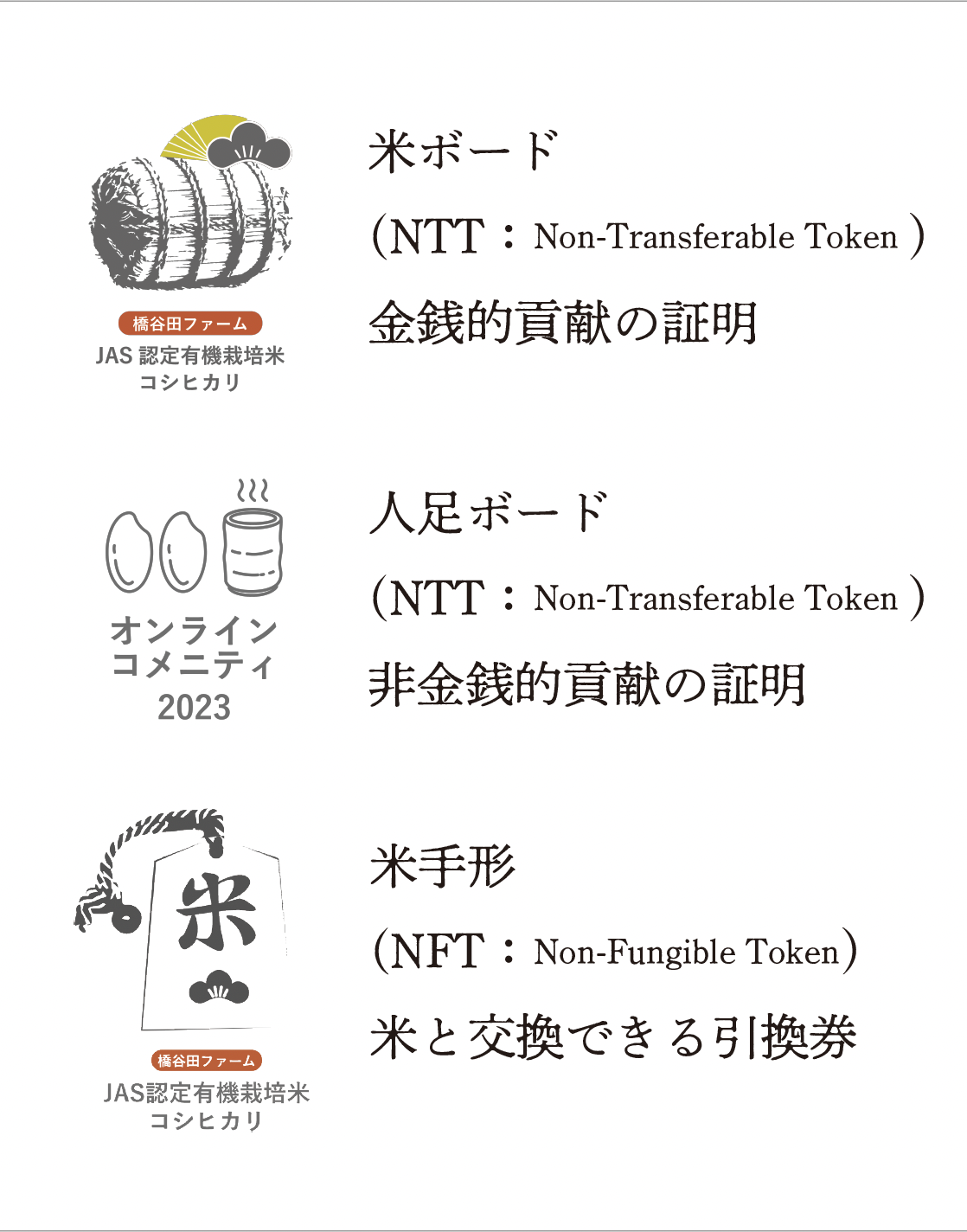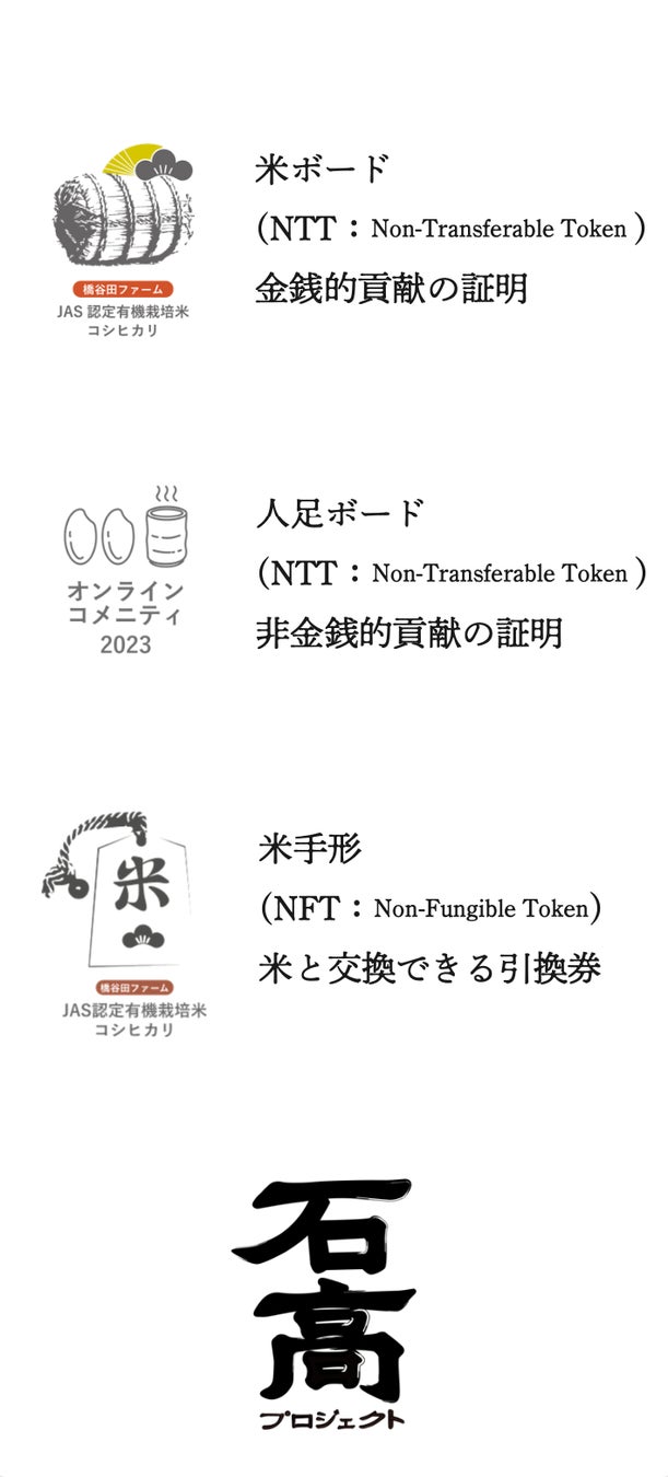 モバイルアプリでは、金銭を起点とした貢献(米ボードを付与)だけでなくボランティアなどの非金銭的なものを起点とした貢献(人足ボードを付与)も同一システム上で評価をすることによって、「持続可能な農業のある未来」をめざして、農業に対する多様な関わり方をデジタル上で実現しました。今後「米市場(NFTマーケット)」や「石高コイン(地域通貨)」など、包括的な仕組みを展開をするべくシステムを構築中です。