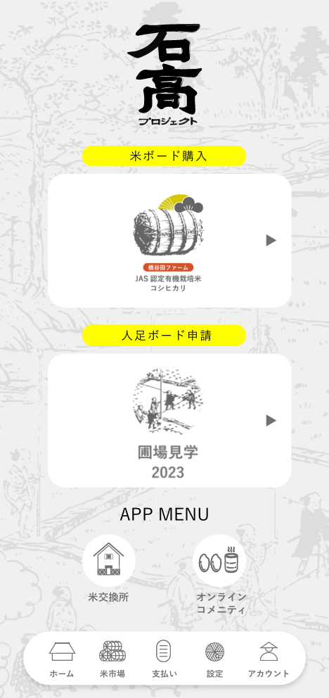 当町では、基幹産業である米の後継者不足、米価下落にともなう町全体の衰退に歯止めをかけるための一手として、デジタル技術を活用した米に対する価値観の転換・米の販路拡大・関係人口の拡大のため、そして「持続可能な未来型地域」を目指すため、実証事業「石高プロジェクト」を進めています。その出発点として、地域の課題解決や農業の振興を目的とした、新たなシステムとしてのモバイルアプリを開発しました。米作りに焦点をあて農家とファンが支え合う仕組みをデジタル上で実現し、“故くて新しい“農業を考えます。