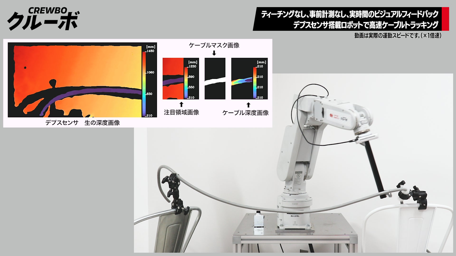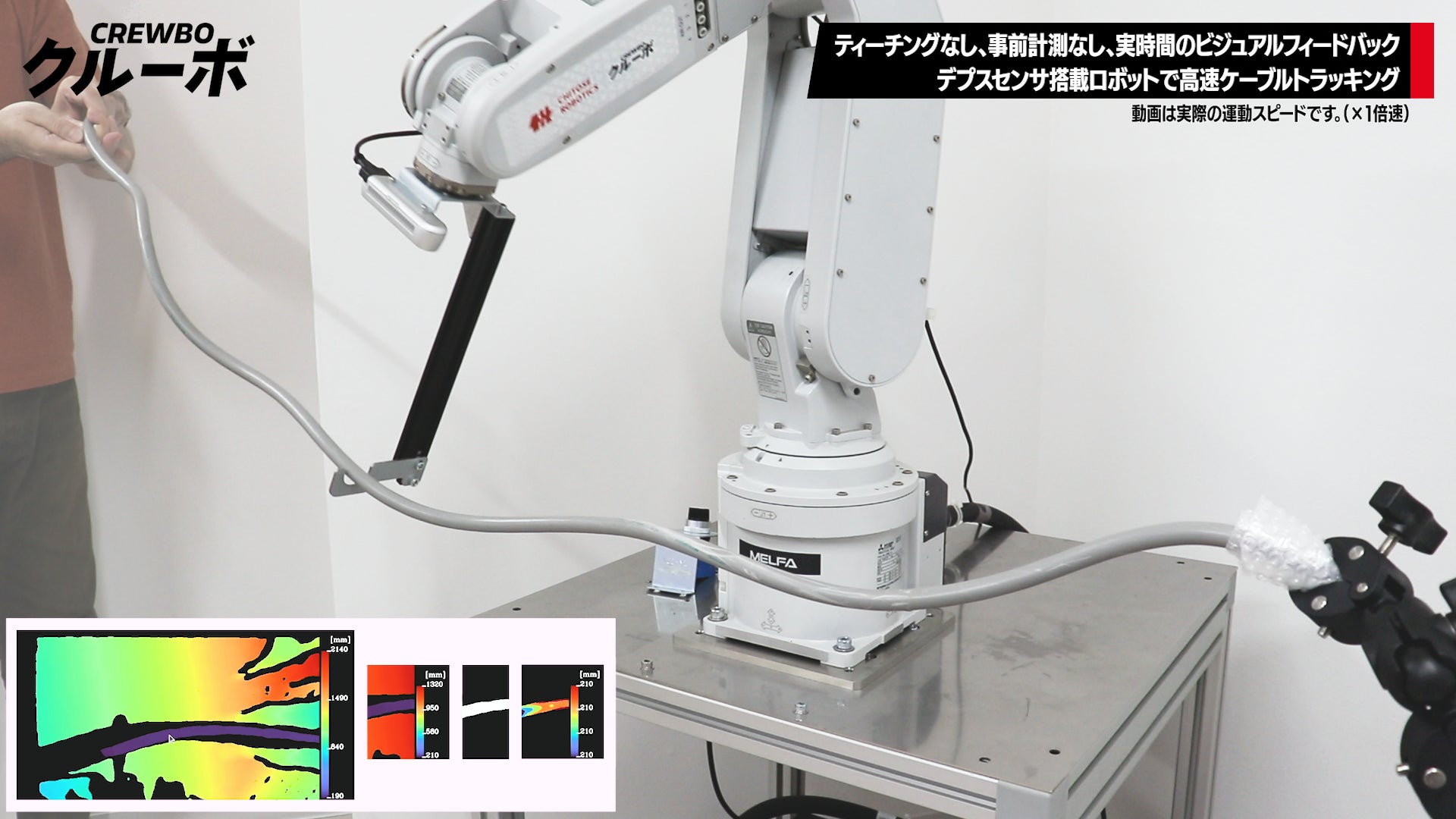 ここでは、ロボット制御ソフト「クルーボ」に「デプスセンサユニット」を追加インストールすることで、モデル化が困難な不定形ケーブルハーネスに対してビジュアルフィードバック制御によるトラッキングをご覧いただけます。
