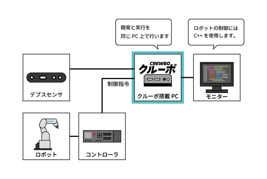 デプスセンサユニットは、チトセロボティクスが提供する産業用ロボット制御ソフトウェア「クルーボ」に追加インストールして使えるソフトウェアです。ご購入時には、現場で使えるデプスセンサとサンプルプログラムが付属し、すぐに自動化アプリケーション制作にご活用いただけます。サンプルプログラムでは、次の動画にある「不定形ケーブルトラッキング動作」を実装することができます。