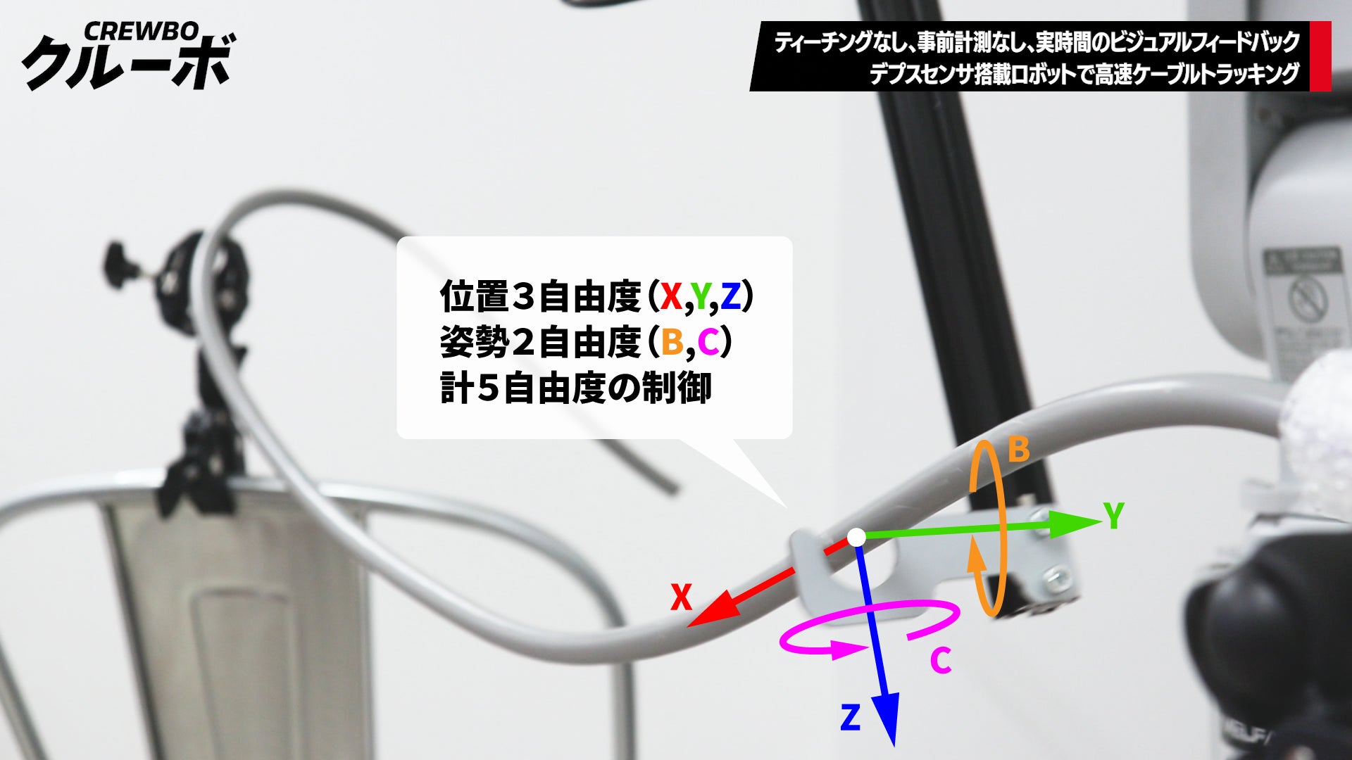 デプスセンサユニットで認識した画像からロボットの手先位置と手先姿勢をケーブルのしなりやうねりにあわせてロボットへの制御入力を行っています。