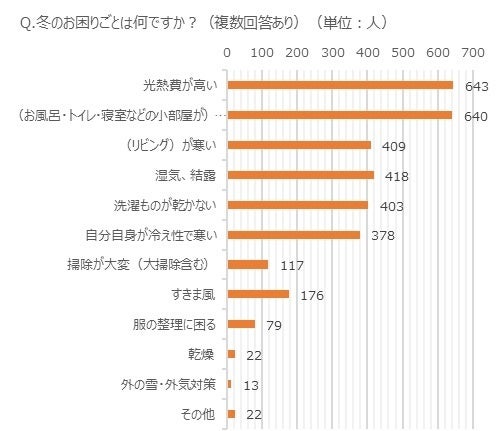 11月に実施した「冬のお困りごと」についてのアンケート結果では、「光熱費が高い」こと、家中の「寒さに悩んでいる」という回答が続きました。(調査日:2023/11/9~2023/11/16 協力:ミルトーク 回答者数1,237人 複数回答あり)