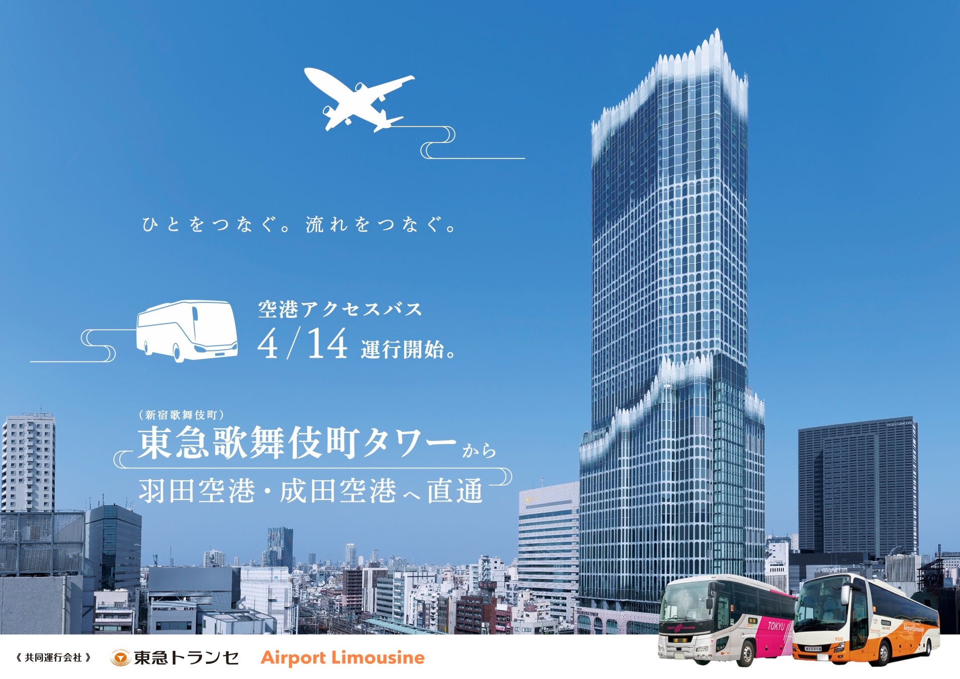 株式会社東急トランセ(本社:東京都目黒区、取締役社長:古川 卓)および東京空港交通株式会社(本社:東京都中央区、代表取締役社長:内波 謙一)は、東急株式会社および株式会社東急レクリエーションが新宿歌舞伎町で開発を進めている「東急歌舞伎町タワー」の開業日2023年4月14日(金)にあわせて、同タワーから『羽田空港』・『成田空港』への空港アクセスバスを新設いたします。