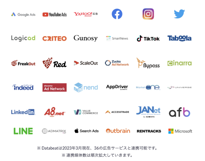Databeatは、広告レポート作成自動化ツールです。2023年10月1日時点でデータ連携可能な広告サービスは36サービスとなっており、主要な広告媒体のほとんどをカバーしています。