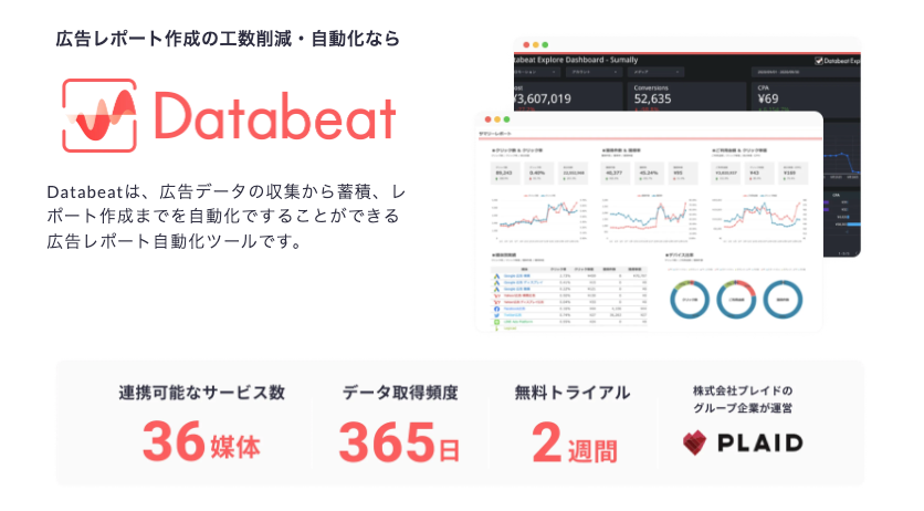 アジト株式会社が開発・提供する広告レポート自動化ツール「Databeat」