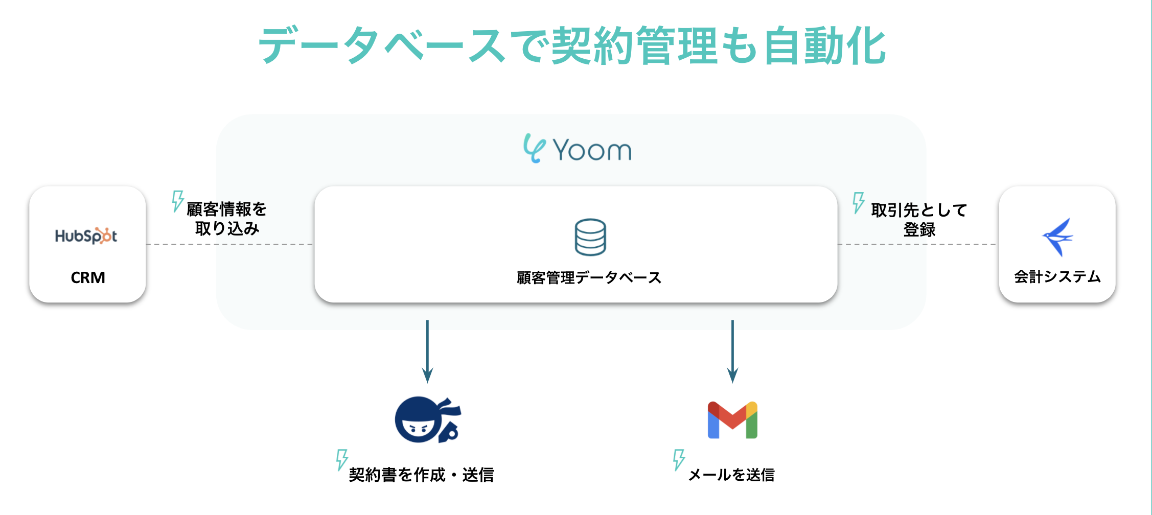 『NINJA SIGN by freee』と『Yoom』を連携することで、下記のような一連の契約フローをノーコードで自動化することが可能です。